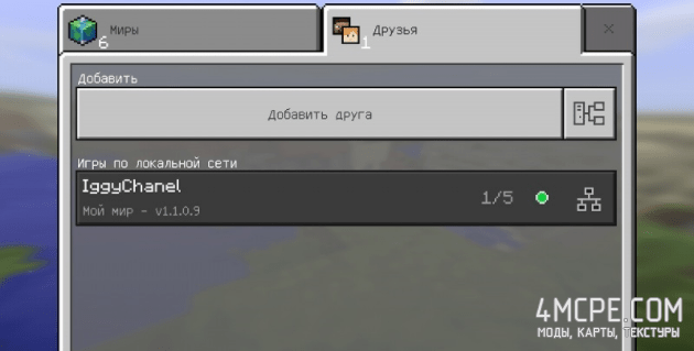После того, как вы создадите игровой мир, попросите остальных друзей зайти в игру и перейти в меню выбора игрового мира, где спустя несколько секунд, они могут увидеть созданный вами локальный сервер и начать играть в Майнкрафт ПЕ по локальной сети .