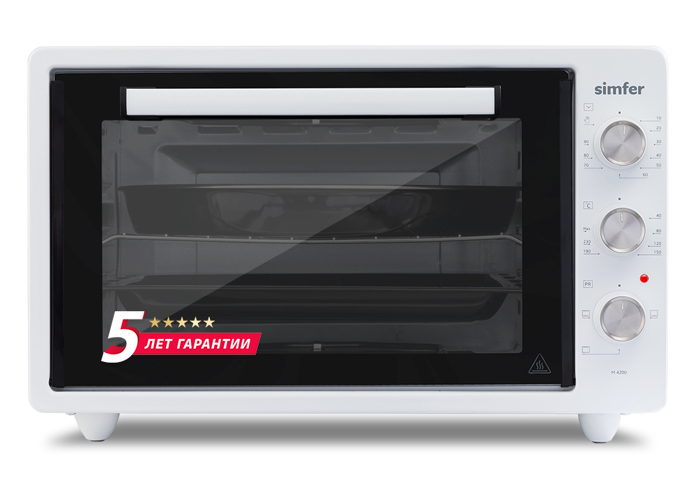Мини-печь электродуховка электрическая духовка Симфер 4206 с 1400 мощность и объемом 42 л куплена 23 февраля 2016 за 8690руб в онлайн-трейд . 5 лет работает, но из-за дверцы вынуждены купить новую .