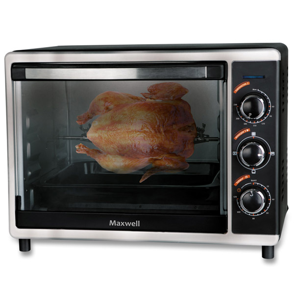 Мини-печь подогревает и размораживает продукты, укомплектована 2 противнями, решёткой и вертелом с ручкой для него . Мини-печь весит 10,5 кг и имеет размеры 36х51,5х41,5 см .