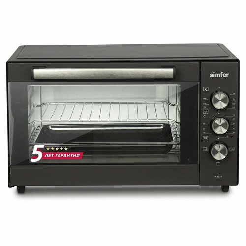 Le torréfacteur Simfer M3510 appartient à la série de modèles Classic. Il s'agit d'un four électrique de table compact dont la fonctionnalité vous permet de préparer tous les plats - poisson, légumes, viande, pâtisseries et confiseries. Une gamme de possibilités aussi étendue est offerte par la présence de trois modes de cuisson - avec chauffage par le haut, par le bas et combiné (haut + bas). Le choix de la méthode optimale de cuisson ou de chauffage des aliments est effectué par un régulateur spécial situé sur le panneau de commande dans la partie avant du mini-four à droite. Il existe également deux autres régulateurs : la température et le temps de cuisson. Le premier vous permet de définir une plage de température appropriée de 40 à 240 degrés. Lorsque le maximum des valeurs spécifiées est atteint, l'option d'arrêt automatique est activée. Le second règle la durée de fonctionnement du four de comptoir. Une option supplémentaire est une minuterie d'une heure et demie, qui vous permet d'arrêter la cuisson après une durée spécifiée par l'utilisateur. La popularité des mini-fours électriques Simfer auprès des consommateurs domestiques s'explique par un certain nombre d'avantages impressionnants : une isolation thermique fiable, qui évite les pertes de chaleur et l'échauffement des surfaces en contact avec le torréfacteur ; dimensions compactes, vous permettant de déplacer ou de transporter facilement du matériel jusqu'à l'emplacement souhaité ; pieds caoutchoutés qui assurent la stabilité du mini-four sur un plan de travail ou autre surface ; design attrayant de couleur anthracite avec détails décoratifs argentés ; un four spacieux avec une lampe d'éclairage intégrée pour un contrôle visuel du processus de cuisson ; fonction de nettoyage à la vapeur, qui simplifie et accélère le nettoyage et l'entretien des surfaces internes du four électrique ; Le haut niveau de fabrication traditionnel du fabricant turc offre une combinaison de fiabilité et de durabilité. Chaque rôtissoire est livré avec une grille chromée, une plaque à pâtisserie antiadhésive, un ramasse-miettes et des instructions d'utilisation détaillées. La garantie sur les équipements Simfer est de cinq ans.