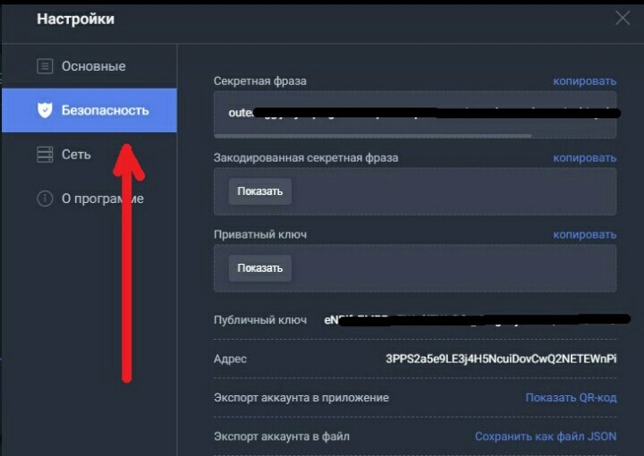 9. В разделе «Настройки», пункт «Безопасность», кнопка «Показать». Найдете Секретную фразу, сохраняйте в недоступных местах. Также сохраните пароль от аккаунта.