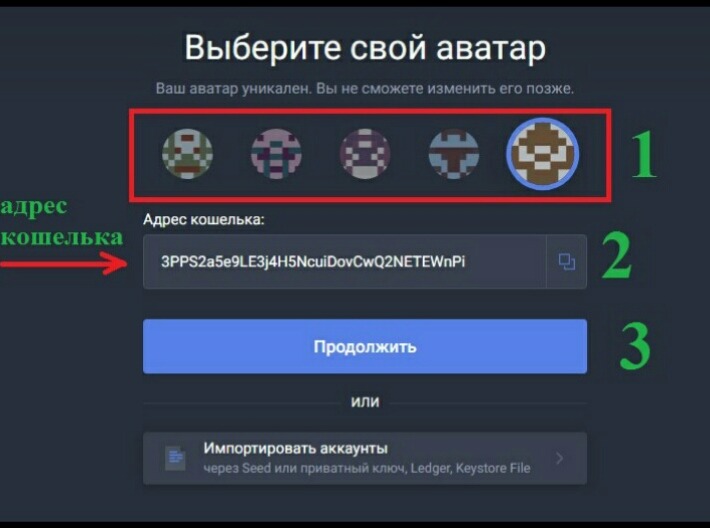 6. Выбирайте аватар для аккаунта/кошелька. Скопируйте адрес кошелька. Далее нажимаем «Продолжить».