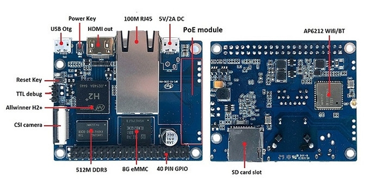 Компьютер будет работать на процессоре Allwinner H2+, содержащий четыре вычислительных ядра Cortex-A7 с тактовой частотой до 1,2 ГГц со встроенным графическим ускорителем Mali-400MP2 с частотой 600 МГц.