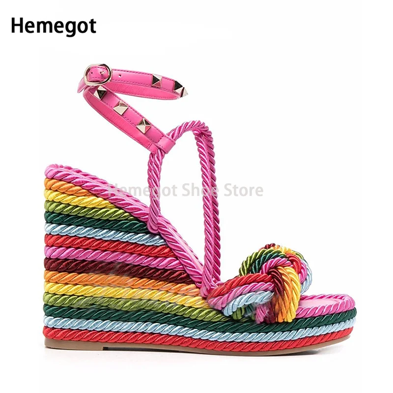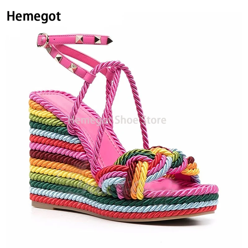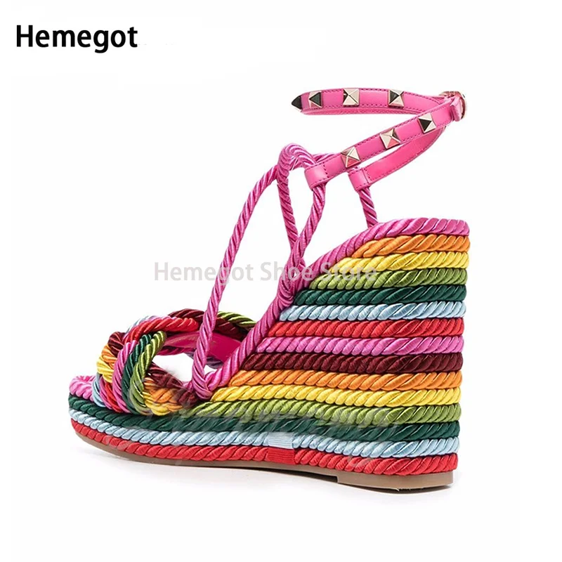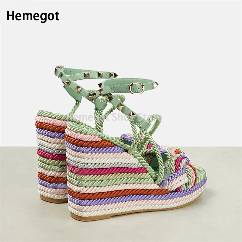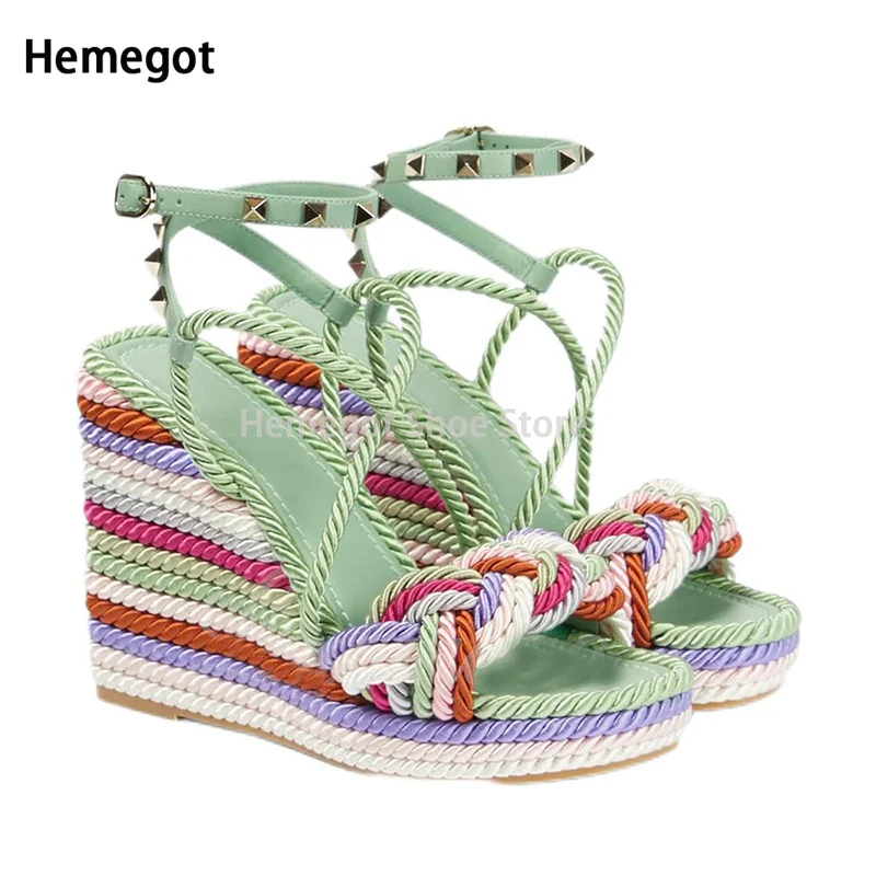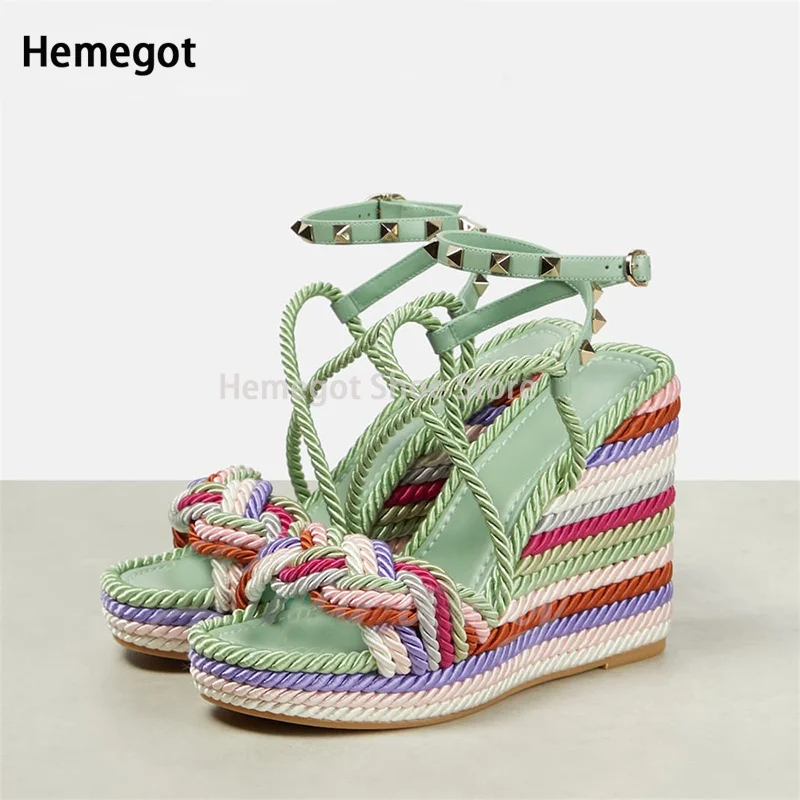 Mint Green Hemp Rope Rivet Wedge Sandals Espadrilles Strap Platform Summer Sandals for Women Designer Style Colorful Shoes - Купить с бесплатной доставкой