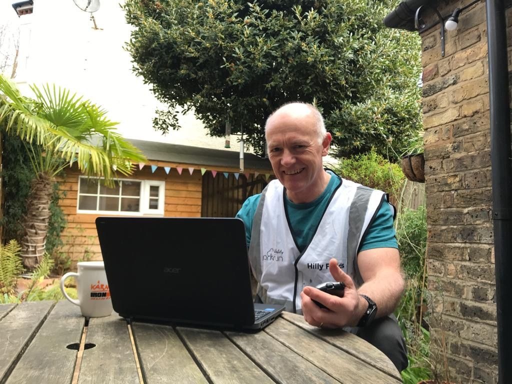 Директор Британского Hilly Fields parkrun провёл утро возле дома, но с привычными атрибутами: секундомер, манишка и ноутбук.