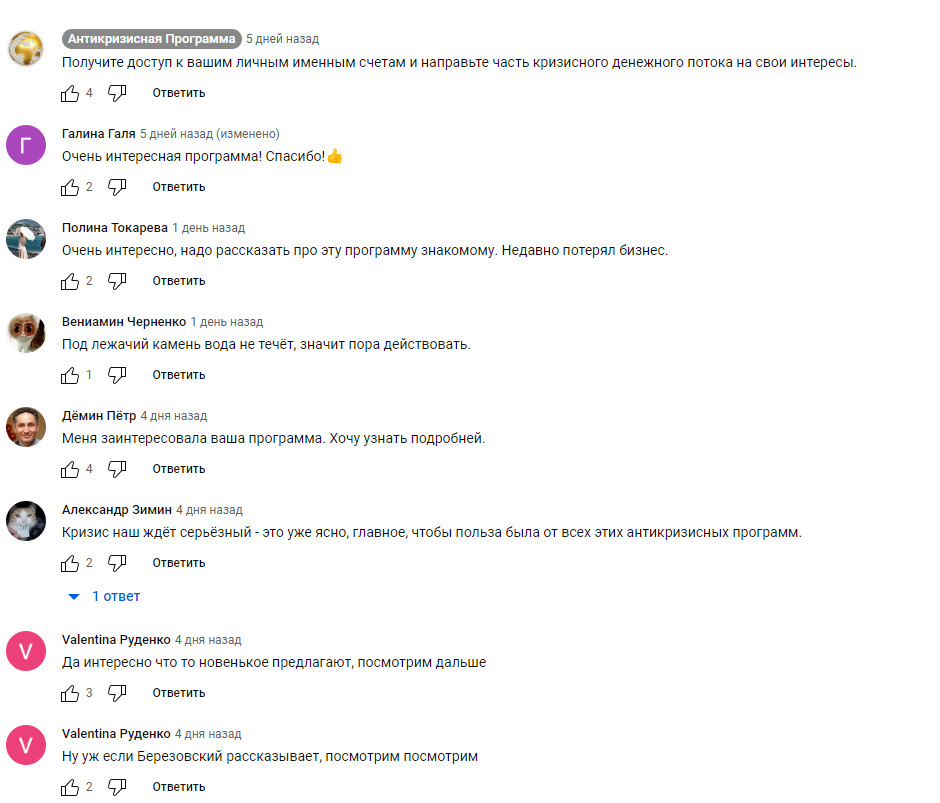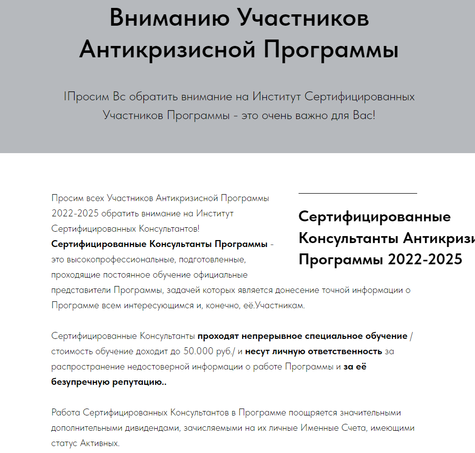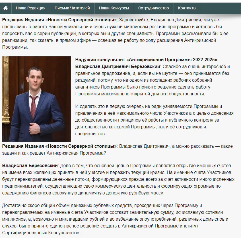 Не возьмемся говорить про кастинги и женский клуб, но вот "Антикризисная программа" имеет все признаки откровенного фейка, основанного на низкому уровне финансовой и экономической грамотности значительной части населения и эксплуатирующего бесконечное желание людей ничего не делать и получать деньги.