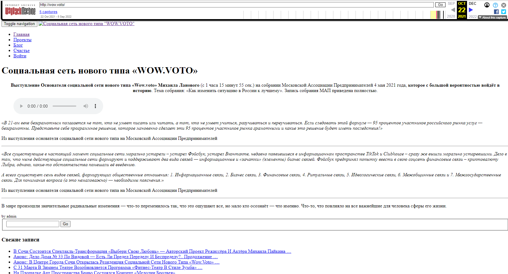 Но вот в веб-архиве сайт остался. И нет, соцсеть вы не увидите. Только пламенные речи её основателя о том, что Facebook, VK и прочие клабхаусы с тиктоками - это мертворожденные проекты.