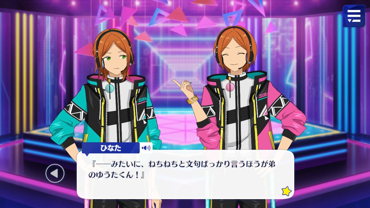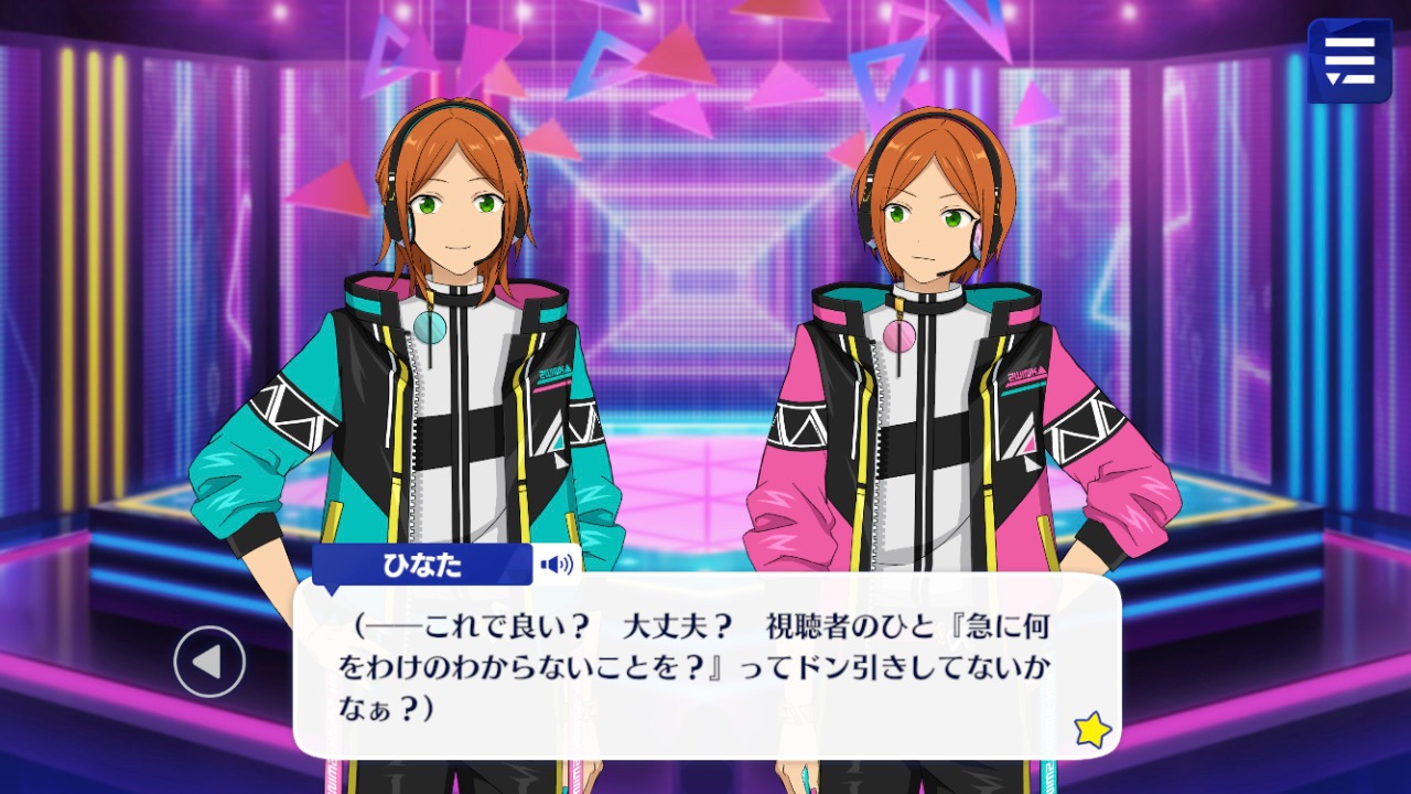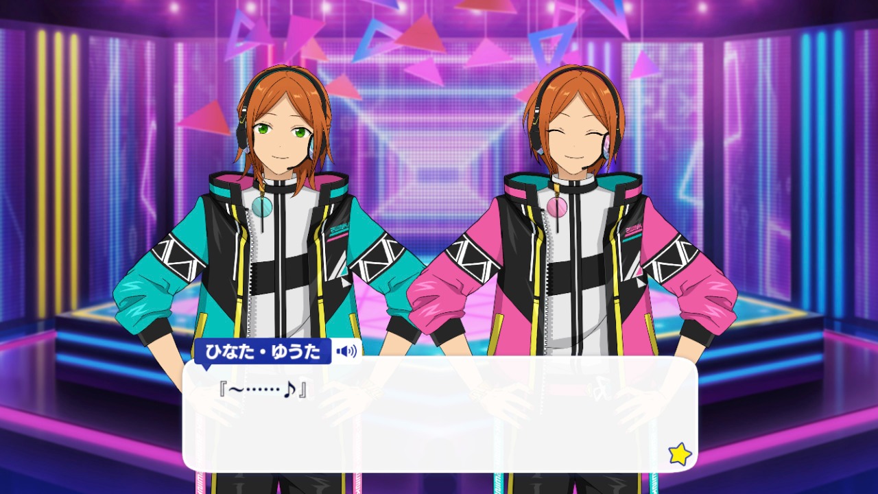Хината: "Как бы то ни было, позвольте мне снова представить нас! Мы - 2wink, айдолы-близнецы, связанные с Cosmic Production!"