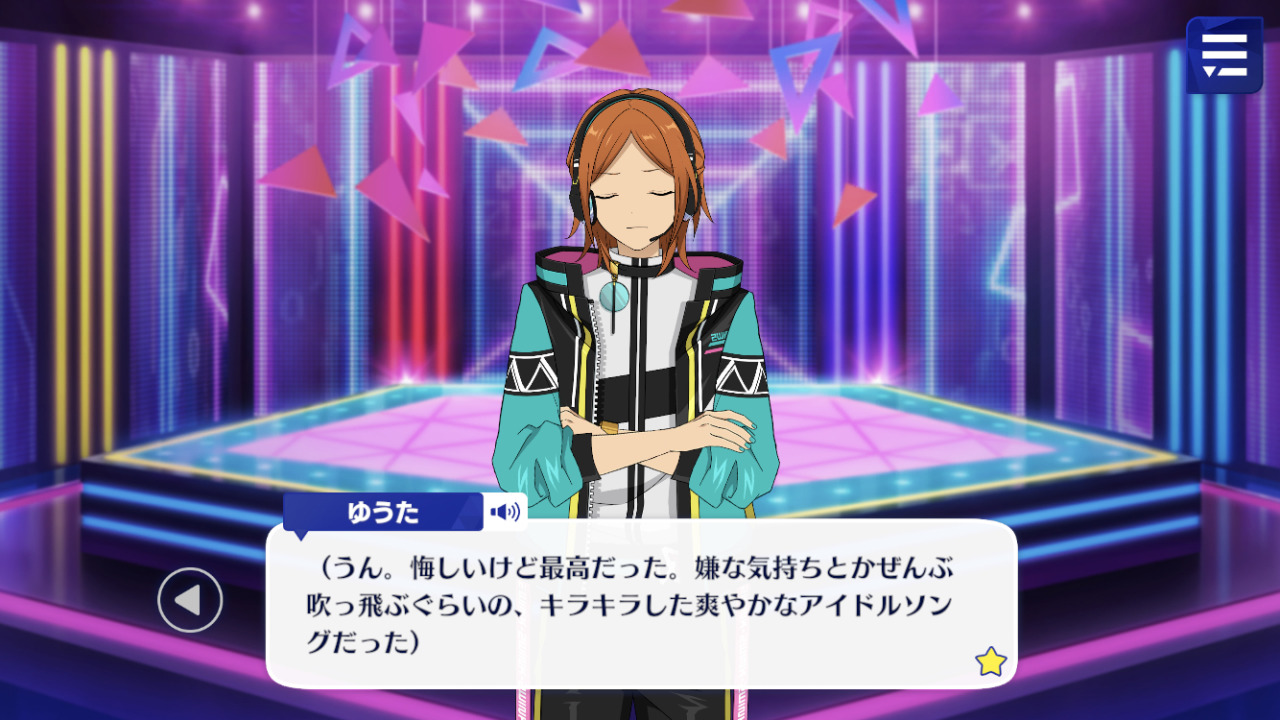 Юта: (Да, обидно признавать, но это действительно так. Это была сверкающая и освежающая песня айдола, которая развеяла все мои обиды).
