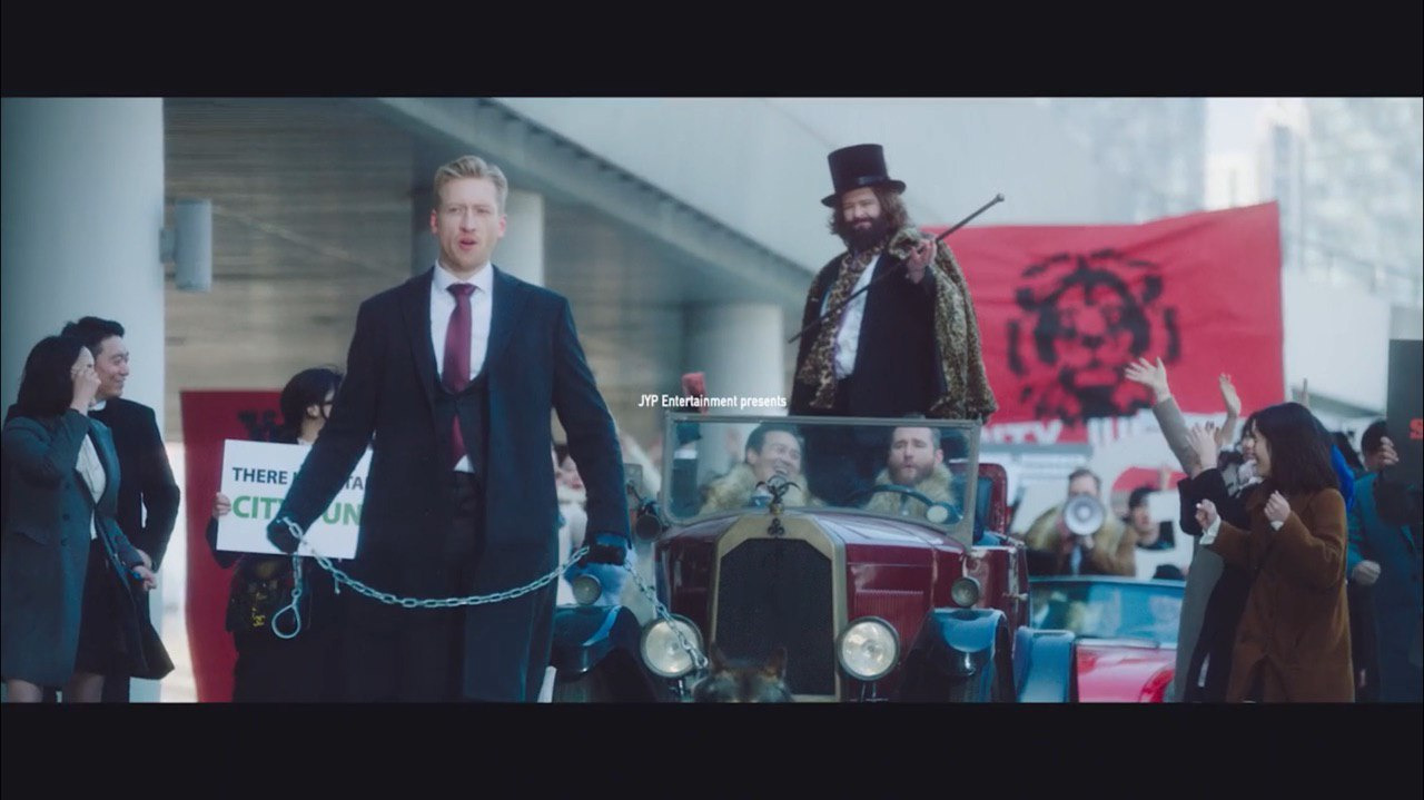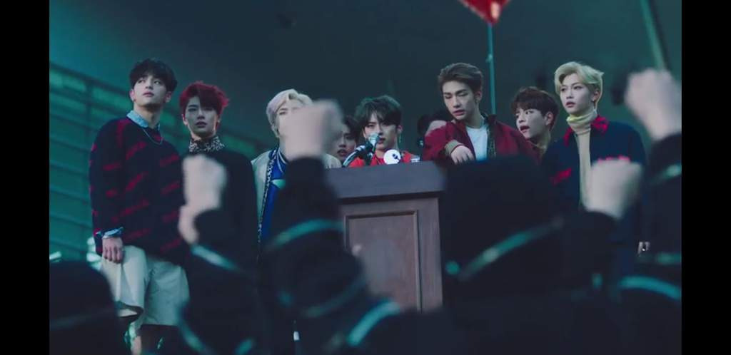 با اینکه داخل ام وی قدم های سریعی داشتن، ولی وقتی بادقت نگاه کنیم میتونیم همه ی بک آپ دنسرها رو ببینیم که تقریبا دارن مثل یه معترض رفتار میکنن که امادن تا همراه اعضا بجنگن همینطور همشون نشانگره سمبل شورش هستن.