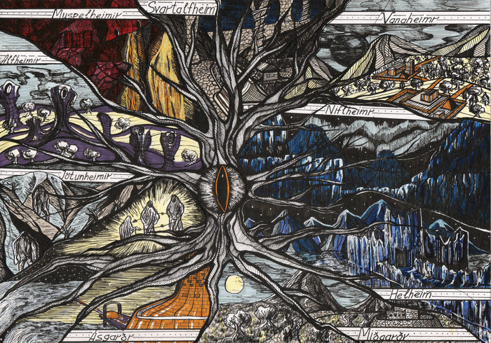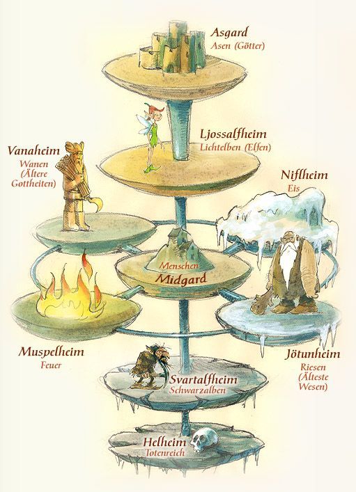 Раскрываем структуру мирового Древа - девять миров Иггдрасиля: Муспельхейм, Асгард, Ванахейм, Льюсальфхейм, Мидгард, Свартальфхейм, Ётунхейм, Хельхейм, Нифльхейм .