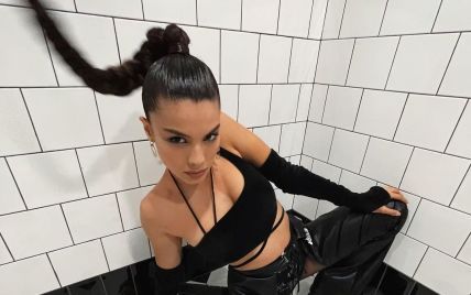 Мишель Андраде . Певица поделилась со своими фанатами нескольким "горячими" снимками из откровенной фотосессии . На фото исполнительница появилась в черных кожаных брюках с высокой посадкой и коротком жакете, который слегка прикрывал обнаженную грудь певицы .