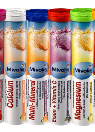 1) Mivolis Multivitamin шипучие витамины Мультивитамин 20 шт . Шипучие таблетки мультивитамины со вкусом тропических фруктов . Содержат 10 самых небходимых витаминов ( С, ниацин, Е, В6, В2, В1, В12, биатин) . Явлется идеальной добавкой к ежедневному рациону . Особенности продукта: Без глютена, без лактозы, подходит для вегетарианецев, веганов .