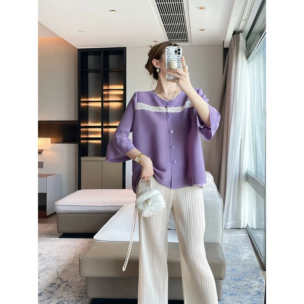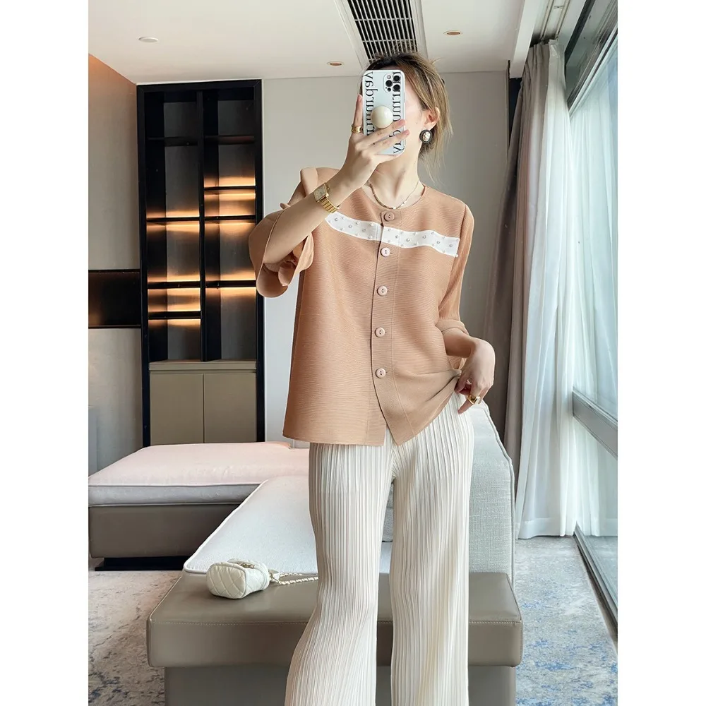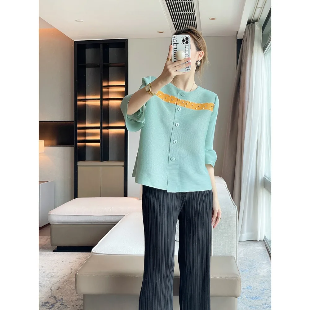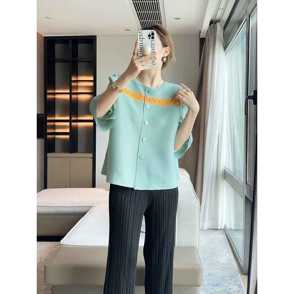 JyyImpPETsHere you can buy Miyake Ruffled Flared Sleeves Beaded Colorblocking Cardigan Top Round Neck Temperament Versatile Jacket Loose Casual Plus Size with free delivery to your post office.