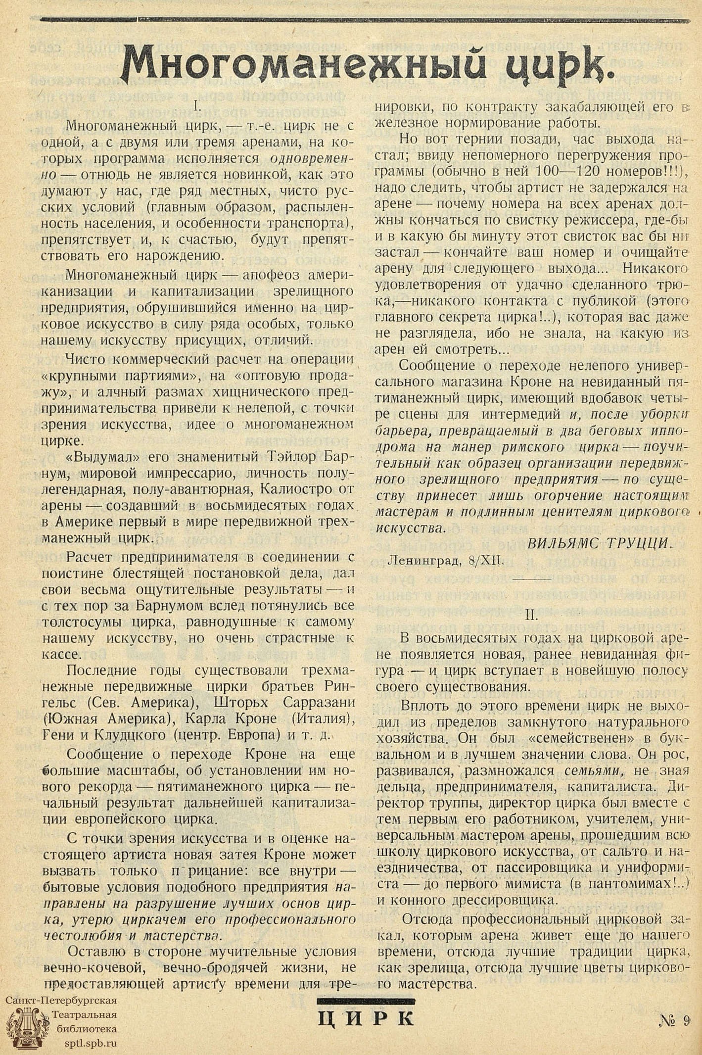 Долгое время еще казалось, что многоманежный цирк, придуманный алчным предпринимателем — лишь болезненный нарост,но сообщение о пятиманежном цирке Кроне, сообщение о пятиманежном пирке на выставке в Вимблей (Англия), известия о переходе многих германских цирков на две арены, убеждают окончательно: это дальнейшим этап существования самого циркового искусства.