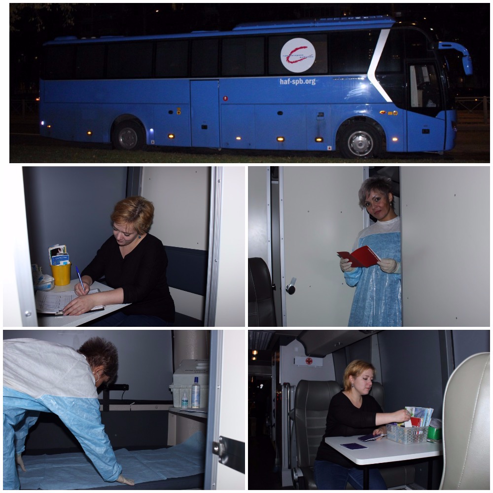 — Наша программа мобильной низкопороговой помощи людям, употребляющим наркотики, носит неформальное название «Синий автобус» и работает в Санкт-Петербурге с 1997 года. Это уже четвертый автобус, как не сложно догадаться, выкрашенный в синий цвет, который мы выпустили на линию за это время, и, пожалуй, самый укомплектованный различными услугами, — рассказывает генеральный директор фонда Сергей Дугин. — Шутка ли: мы принимаем на обмен и утилизацию использованные шприцы, тестируем людей на ВИЧ, вирусные гепатиты B и C, сифилис, проводим профилактику передозировок, сопровождаем людей с положительным результатом экспресс-теста на ВИЧ в Центр СПИД и другие государственные учреждения здравоохранения, оказываем юридические и психологические консультации, помогаем попасть в программы лечения и реабилитации наркозависимости... Поэтому мы и называем этот уникальный мобильный пункт «клиникой на колесах».