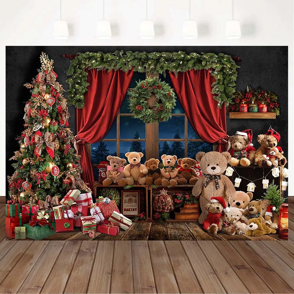 "Mocsicka Wood Floor Christmas Backdrop Bear Doll Toy Xmas Tree Wreath Photography Background Kid Child Portrait Photoshoot Props" * Buy Now Just For 3$