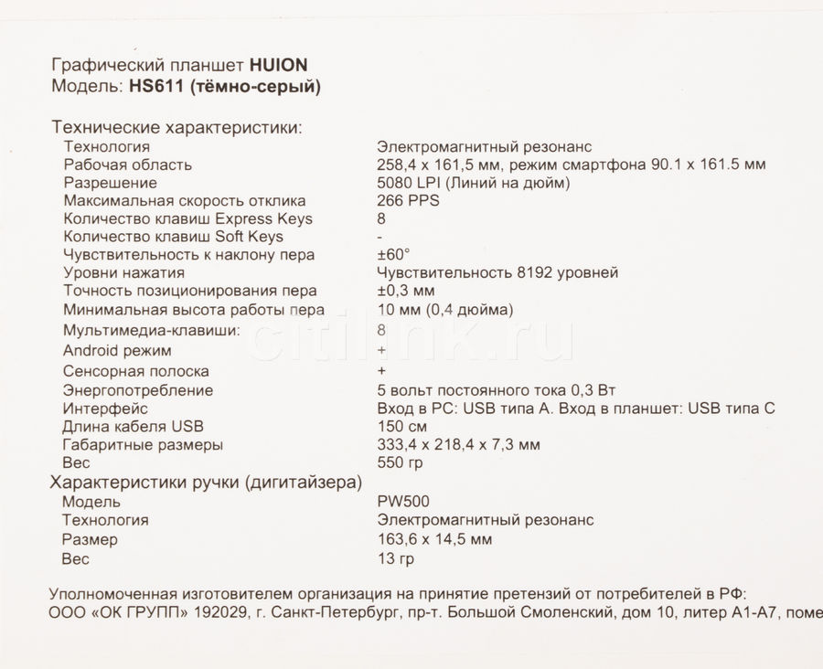 Модель: Huion WH1409 V2; Тип: графический планшет; Размеры: 456 мм (Длина) х 266 мм (Ширина) х 16 мм (Толщина);