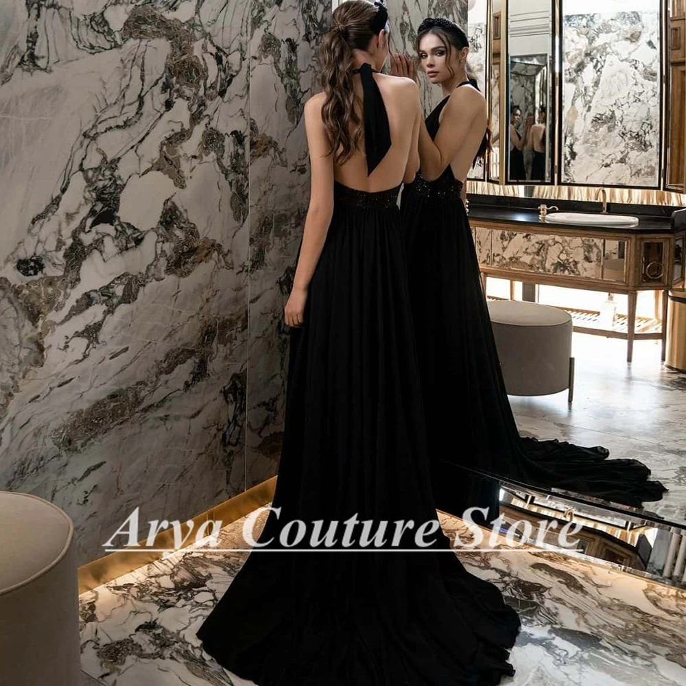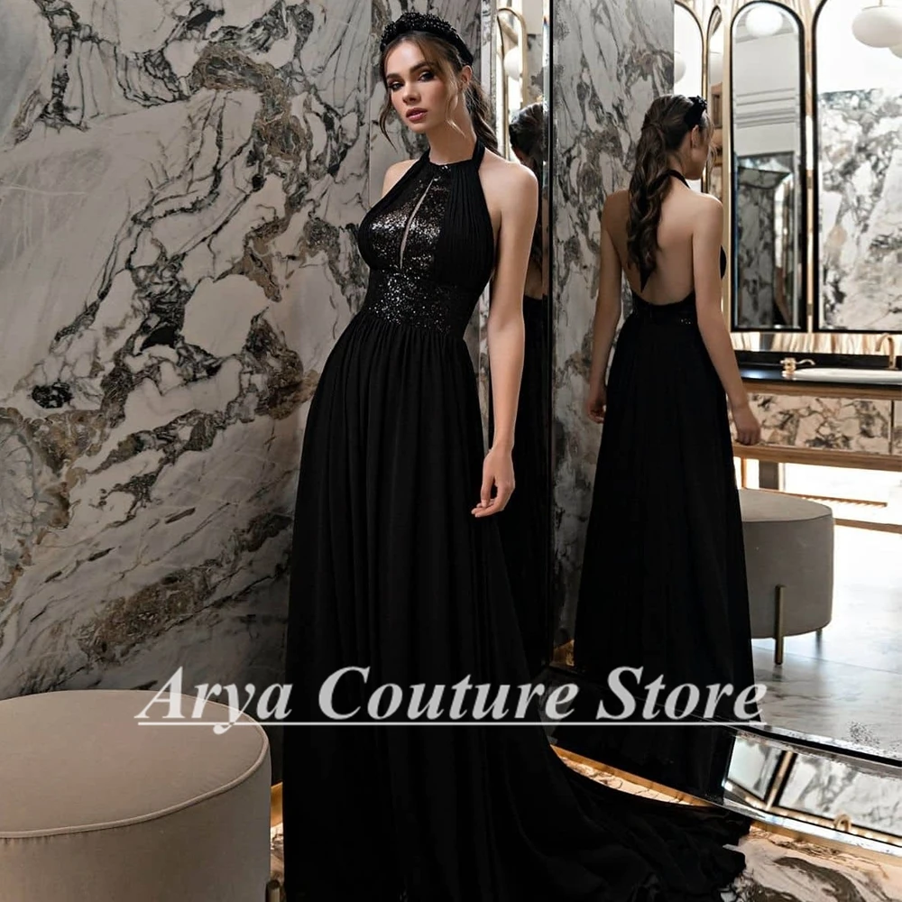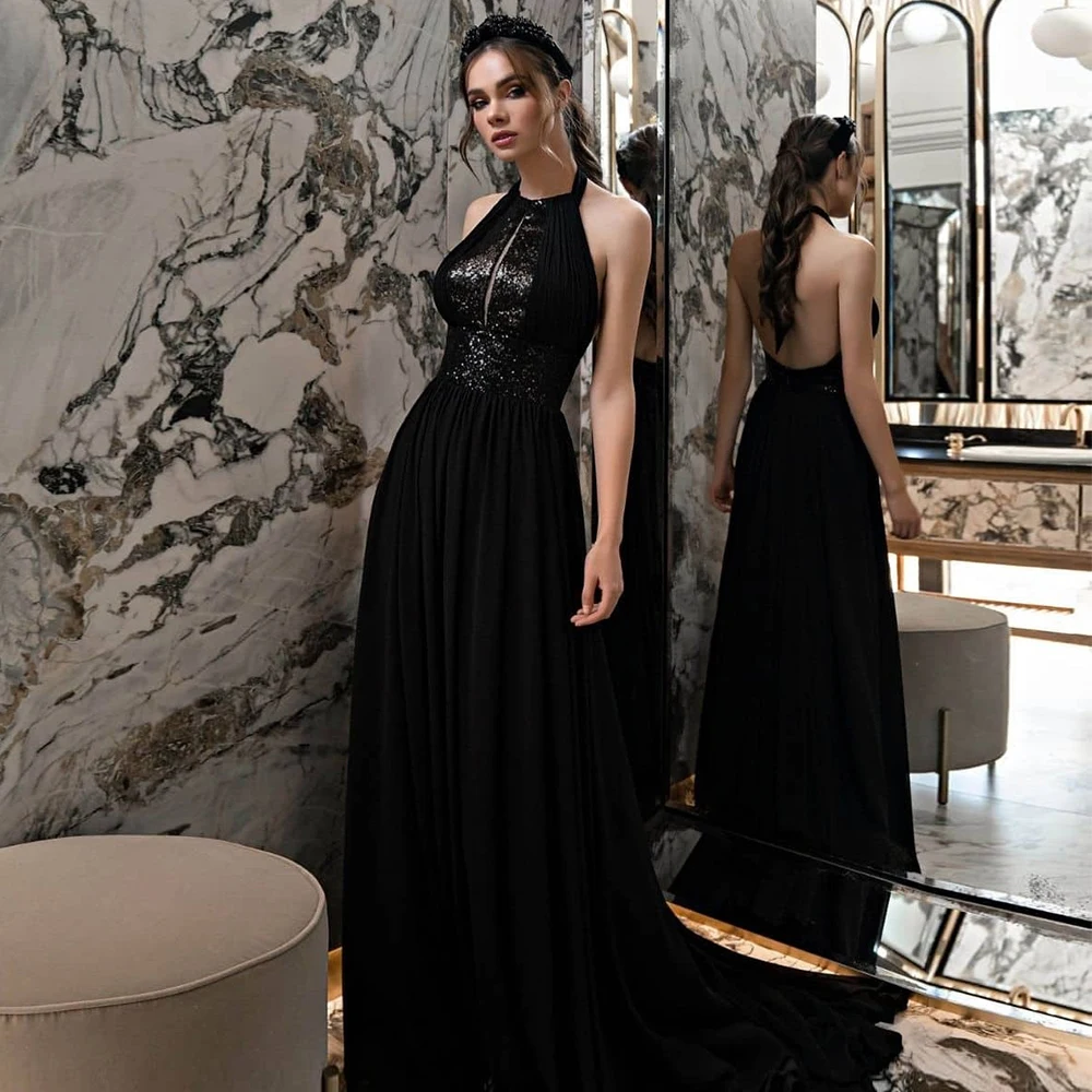 "Modest A-Line Black Sleeveless Evening Gowns 2023 Halter Backless Prom Dresses for Women with Sequined Party Pageant Dresses" * Buy Now Just For 91$