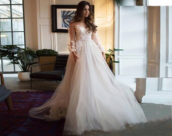 Robe De Mariage Long Sleeve Ball Gown Wedding Dress Illusion Back Hochzeitskleid O-Neck Princess Abito Da Sposa Brautkleid