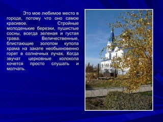 Это мое любимое место . P .S . А вообще мое любимое место - комната, где стоит компьютер . Здесь я сижу на БВ, с удовольствием отвечаю на вопросы, создаю их сама, общаюсь с другими авторами .