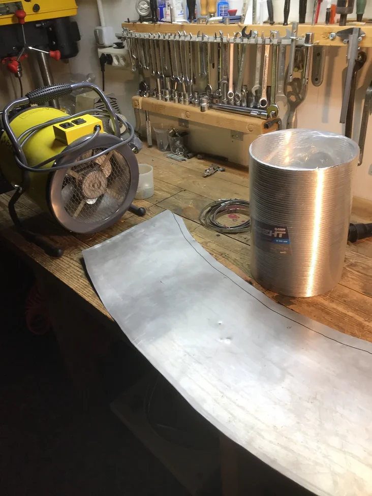 Греть нужно нижнюю часть авто, поэтому там же где нашел пушку, нашел гофру 200 мм, и лист дюрали. Все равно черновой вариант, в итоге вот, я сделяль: