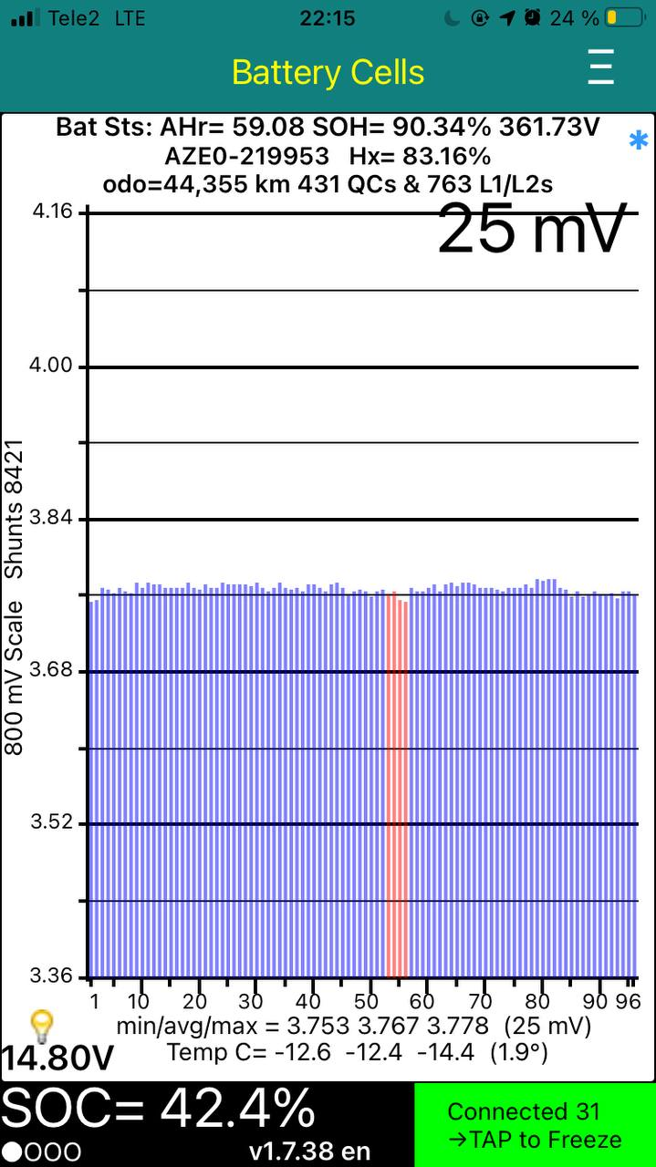 Теперь про наблюдения за температурой батареи. Приехал после работы, поставил на зарядку, подложил мешки, а ночью, что-то около -28. С утра выхожу и вижу вот: