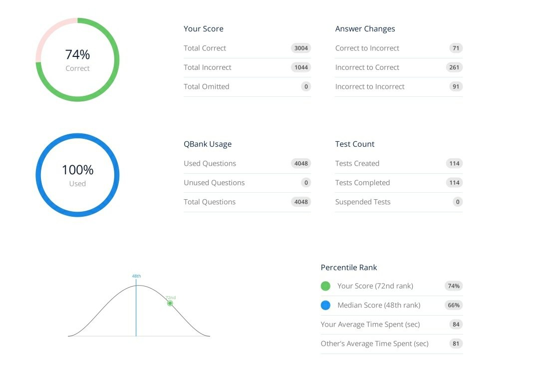 Ребята сдавшие посоветовали идти на экзамен, сказав что нет смысла целиться выше ведь экзамен был pass/fail. Дату экзамена поставил на 2 недели вперед. За это время решил NBME с 25 по 31 и Free 120, в интервале 81-88%.