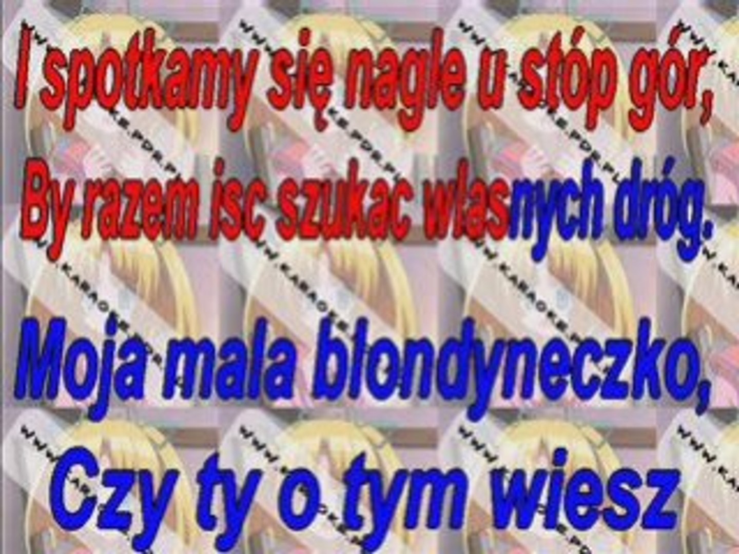 Moja mała blondyneczko, Czy ty o tym wiesz Tyle razy cię spotykam, W każdym moim śnie Moja mała blondyneczko, Czy ty o tym wiesz Tyle razy cię spotykam, W każdym moim śnie Lecz uwierz mi, przyjdzie taki czas Że wiosna wnet, znów połączy nas I spotkamy się nagle u stóg gór By razem iść, szukać własnych dróg Moja mała . . .
