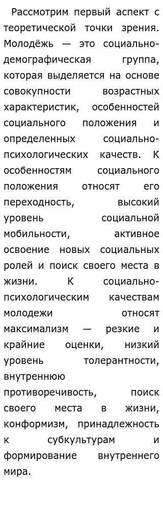 Молодёжь как социологическое понятие . Молодёжь — это социально-демографическая группа, выделяемая на основе совокупности возрастных характеристик (приблизительно от 16 до 25 лет), особенностей социального положения и определённых социально-психологических качеств .