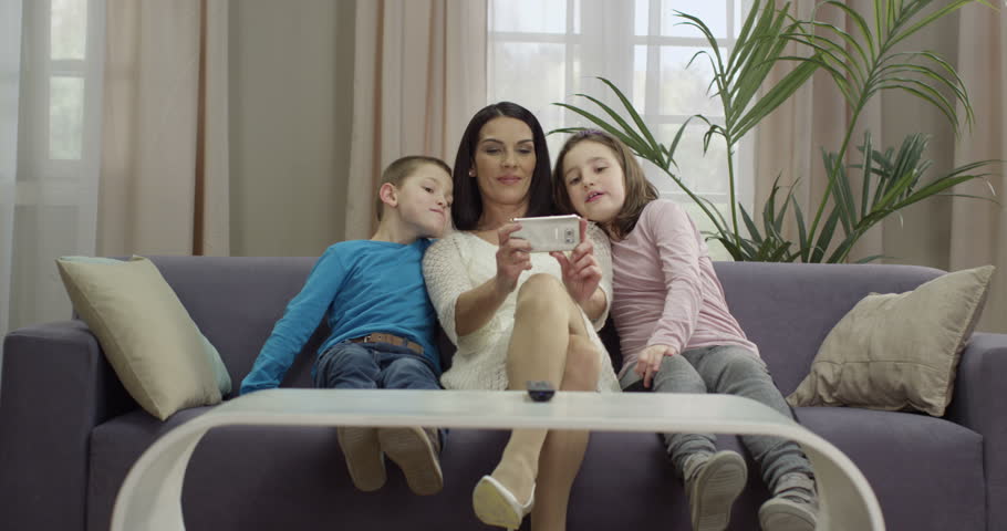 4k00:14A woman in pajamas is sitting on a straightened sofa with a smartphone in her hands.