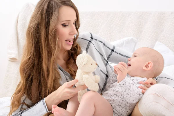 Young woman in bed with her young son . Mom and son waking up together . Mom and son sleep in the morning in bed at . Mom and son sleep in the morning in bed at . Mom and son sleep in the morning in bed at . Mother and young son playing in the bedroom on the bed .