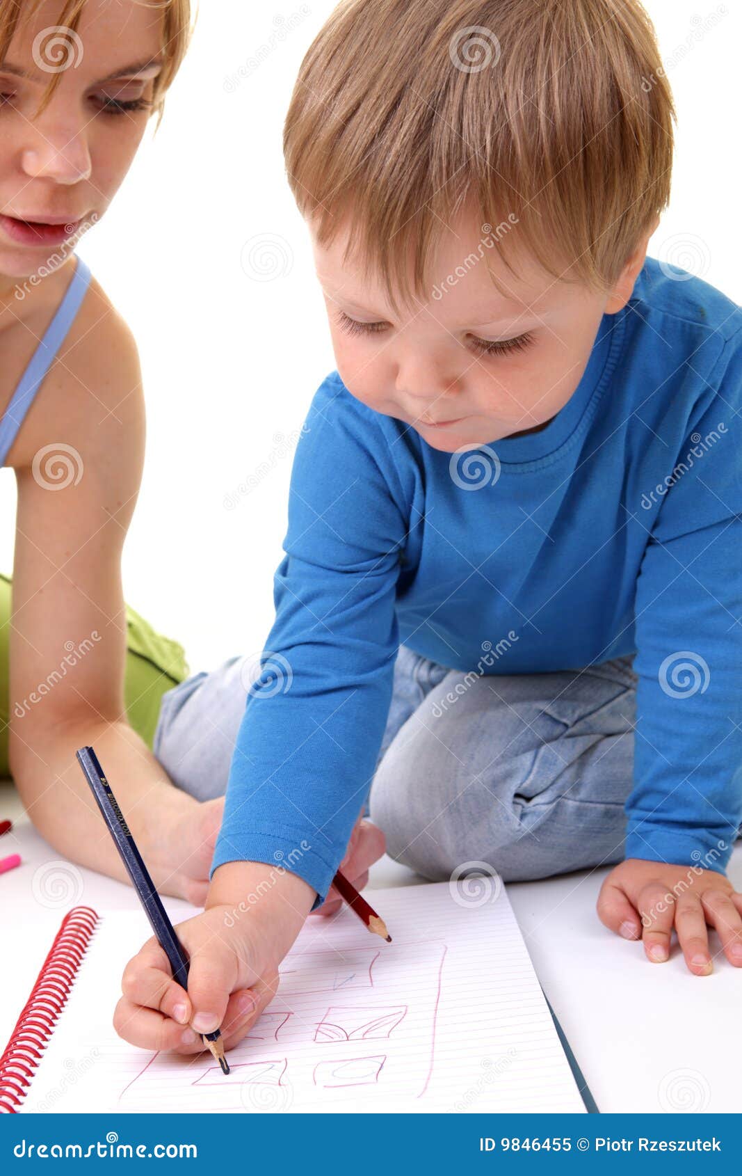 Slow motion of Asian mother helping her son doing homework on white table.