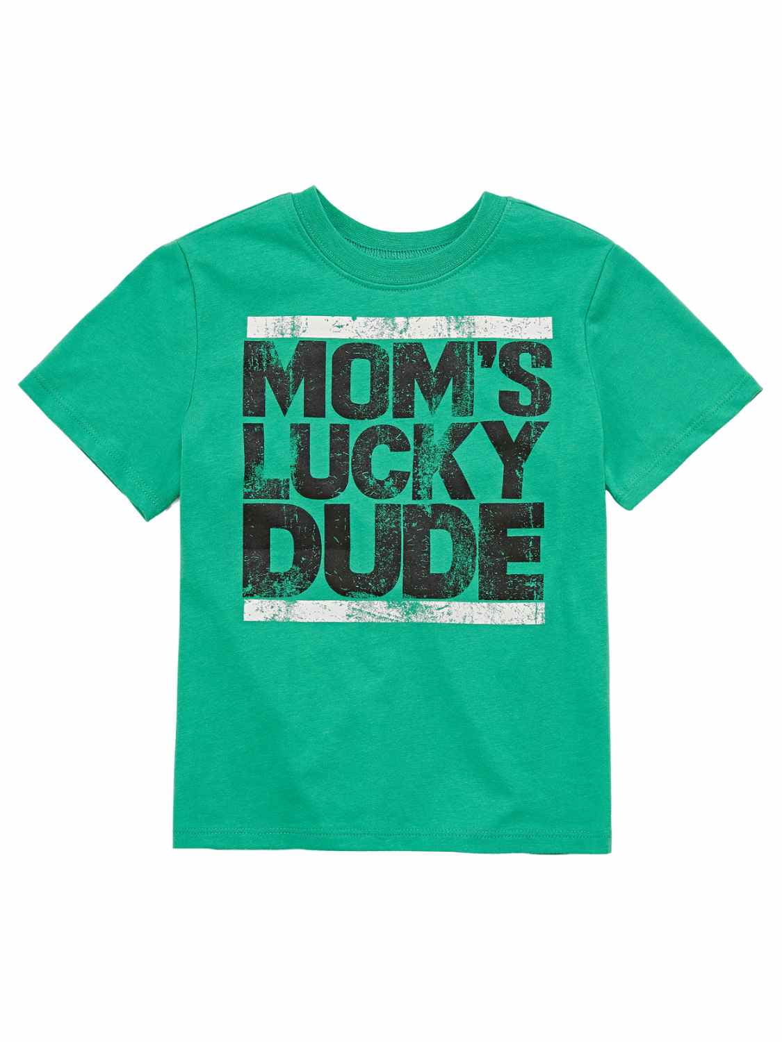 Made of 100% cotton jersey Rib-knit crew neck 'Mom's lucky dude' with shamrock and horse shoe graphic design at front Tagless label Pre-washed for added .