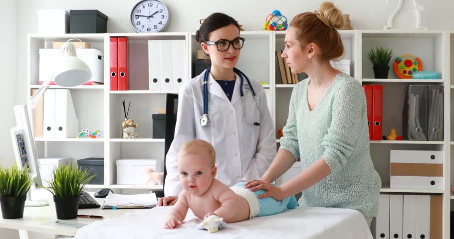Doctor And Nurse Working In Hospital Office With Child Mother