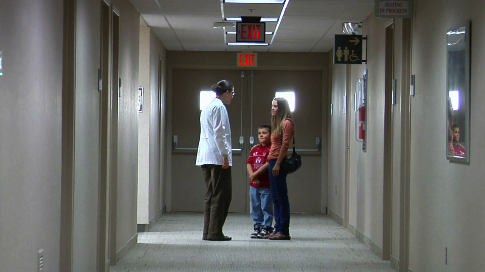 Doctor Speaking To Mom And Son In Hallway