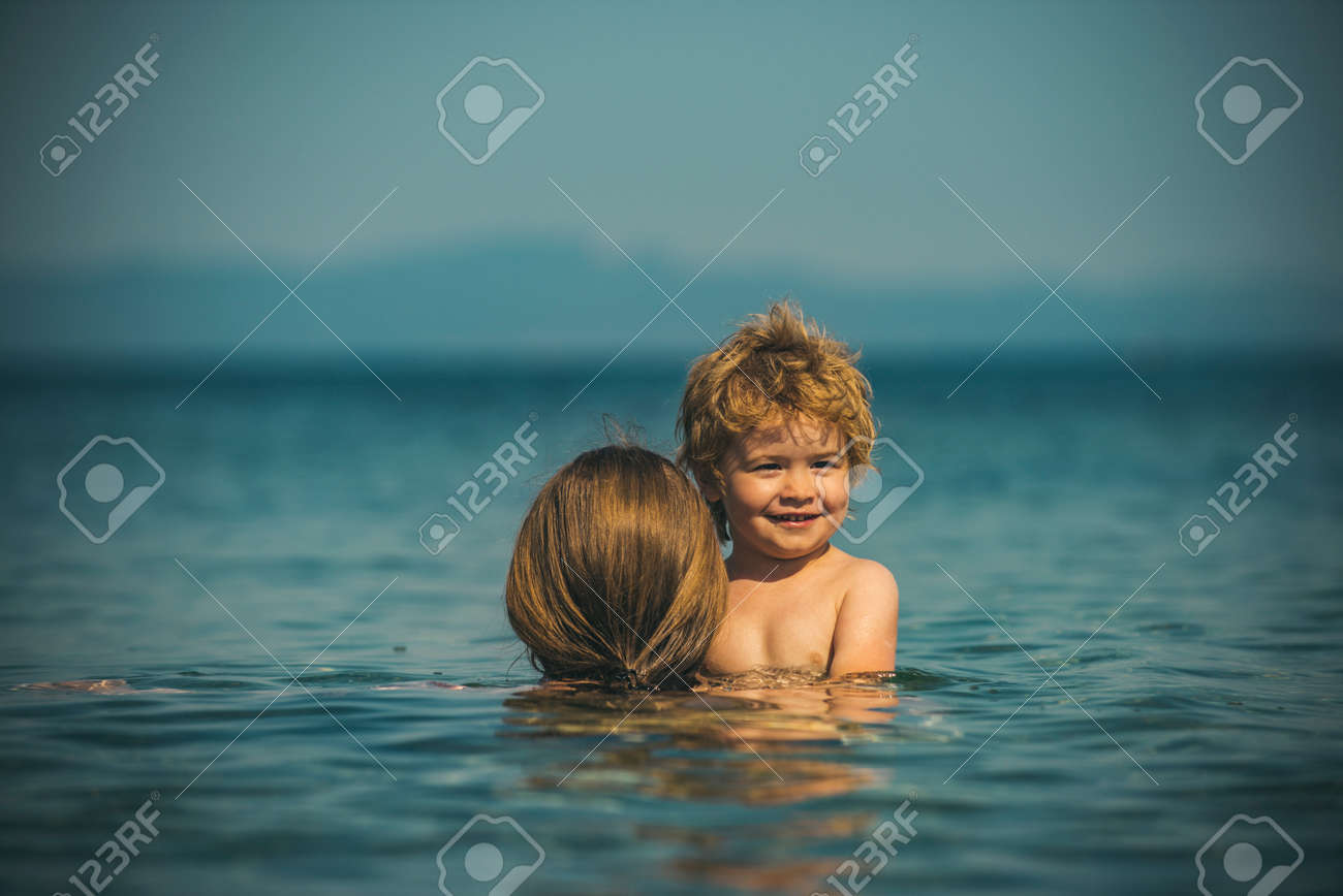 Mom spends free time or weekends with her son in nature or vacation . Mom twirling her son holding him under his arms . HD . A young mother teaches her son to dive into the water in the pool, slow motion . A young woman teaches a little boy to dive in the pool, slow motion . A caring . 4K .