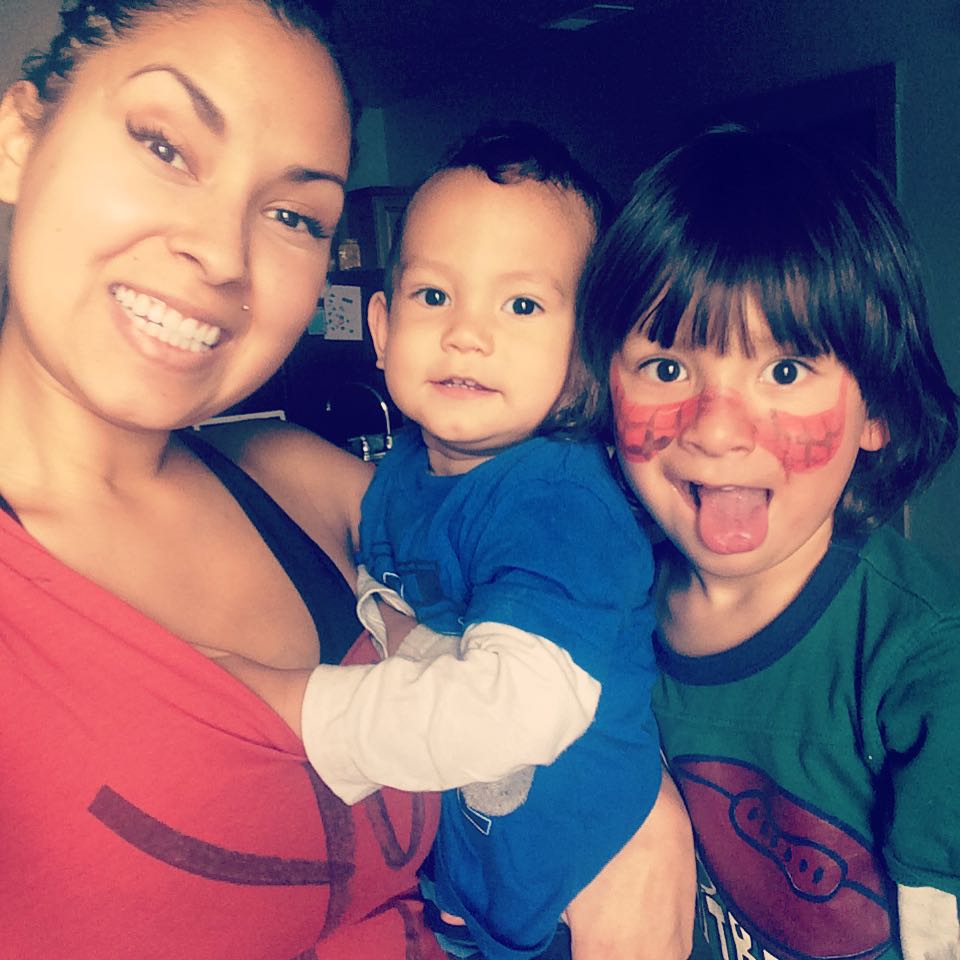 Young mother plays with sons at home