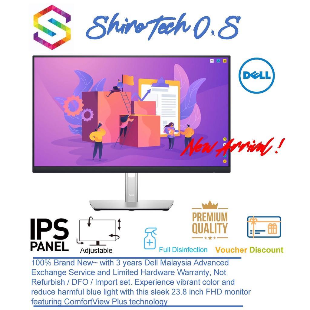 DELL 24 MONITOR | P2422H COMFORT WITHOUT SACRIFICING COLOR Optimize eye comfort with this 23 .8 " FHD monitor with ComfortView Plus .1 The 3-sided ultrathin bezel delivers a seamless view across multiple monitors, while Easy Arrange in Dell Display Manager software helps you stay organized when multitasking . CONNECT TO PRODUCTIVITY