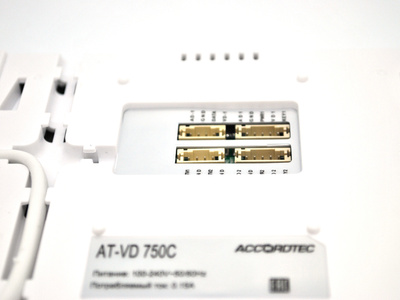 Описание AccordTec AT-VD 750C WHAccordTec AT-VD 750C WH - цветной 4-x проводный, 7" LCD TFT (800x480) видеодомофон . Подключение двух вызывных панелей и двух видеокамер . Накладной тип крепления . Габаритные размеры: 190 x 130 x 25 мм .