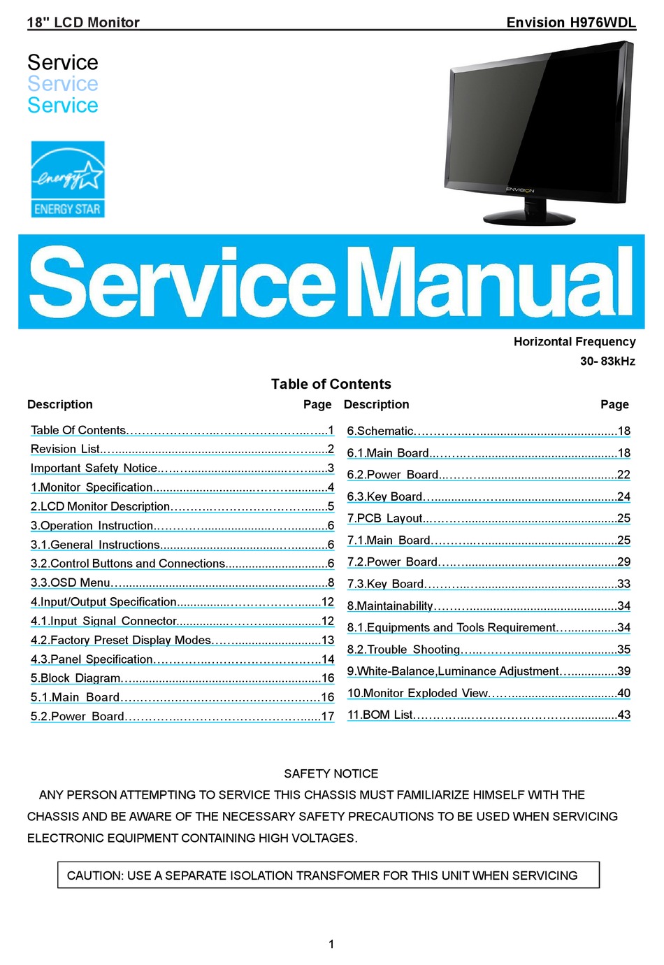 ENVISION H976WDL LCD MONITOR Service Manual download . . .