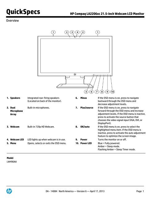 Change the way your company connects, while saving time and money with the HP Compaq LA2206xc 54,6 cm (21 .5") diagonal Webcam LCD monitor . Connect and Collaborate Be there virtually . The LA2206xc monitor delivers a built-in 720p HD webcam, dual microphones and integrated speakers for video conferencing .