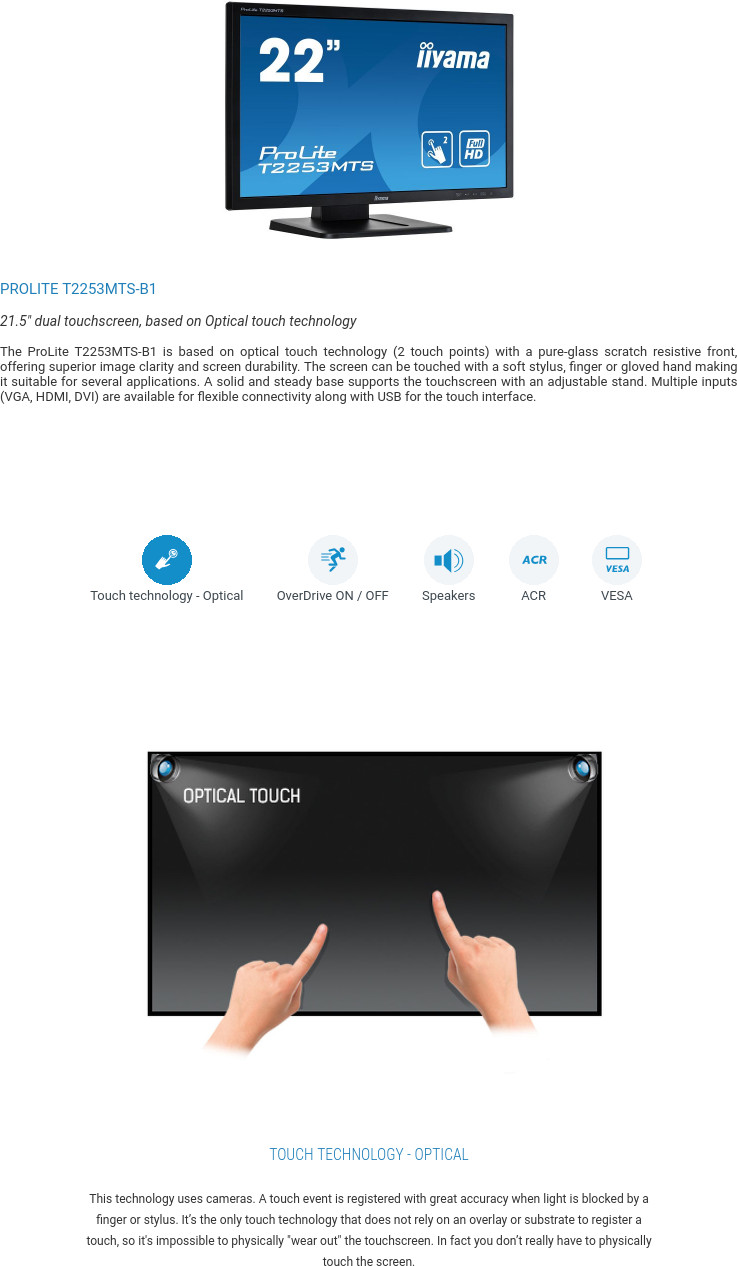Описание Iiyama ProLite T2253MTS - B1 Оптическая сенсорная технология Прикосновение к экрану распознается с высокой точностью, когда свет блокируется пальцем или стилусом .