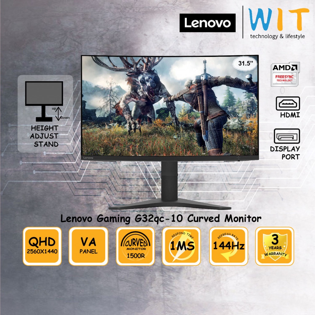 Lenovo G32qc-10 Monitor . Overview; Tech Specs; Overview . Level up your game with this incredible 31 .5-inch curved QHD monitor . With NearEdgeless bezels and a high contrast ratio, experience an engaging gaming experience .