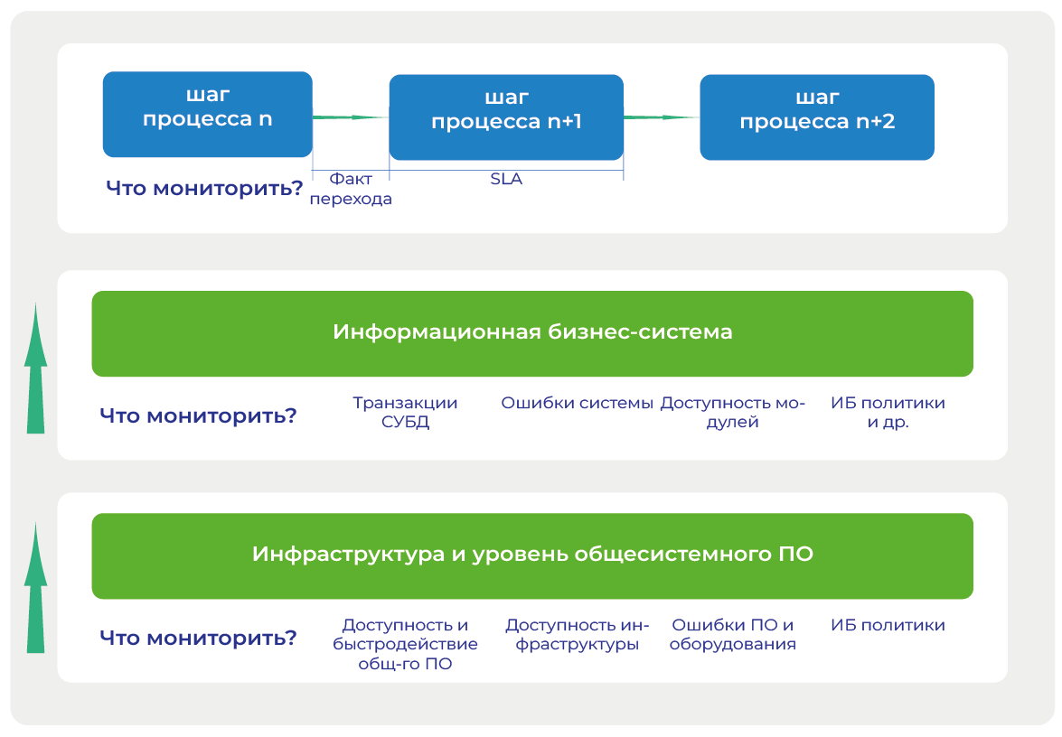 Второе. Достаточно ли мониторинга инфраструктуры и общесистемного ПО? Очевидно, что нет. Бизнес работает в бизнес-системах и ему важно, как быстро проходят транзакции, есть ли где-то задержки, вовремя ли исполняются SLA шагов, вшитых процессов в бизнес-системы?
