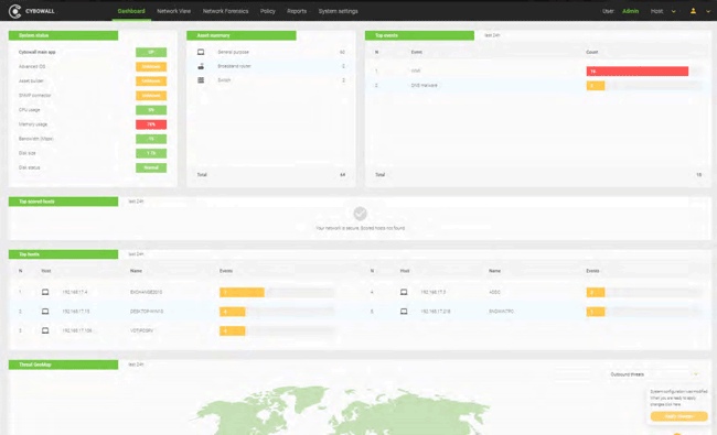 Cybowall сочетает в себе множество инструментов и возможностей для обеспечения кибербезопасности, гарантируя безопасность сетей любых масштабов и обеспечивая единую защиту от постоянно развивающегося ландшафта угроз. Это безагентное решение, которое не требует внедрения и обеспечивает полный и непрерывный мониторинг сети по всем протоколам. Контроль сети осуществляется в режиме реального времени. Выявление и реагирование на угрозы выполняется по мере их возникновения. Мониторинг особенно удобен из-за интерактивной карты распределения инцидентов (см. рисунок 1).
