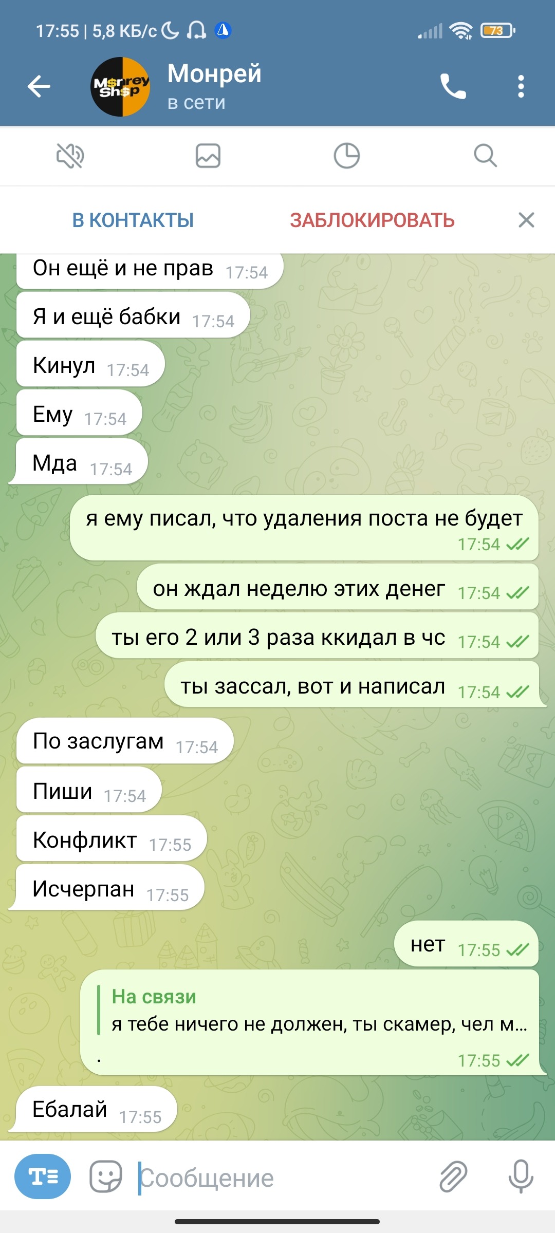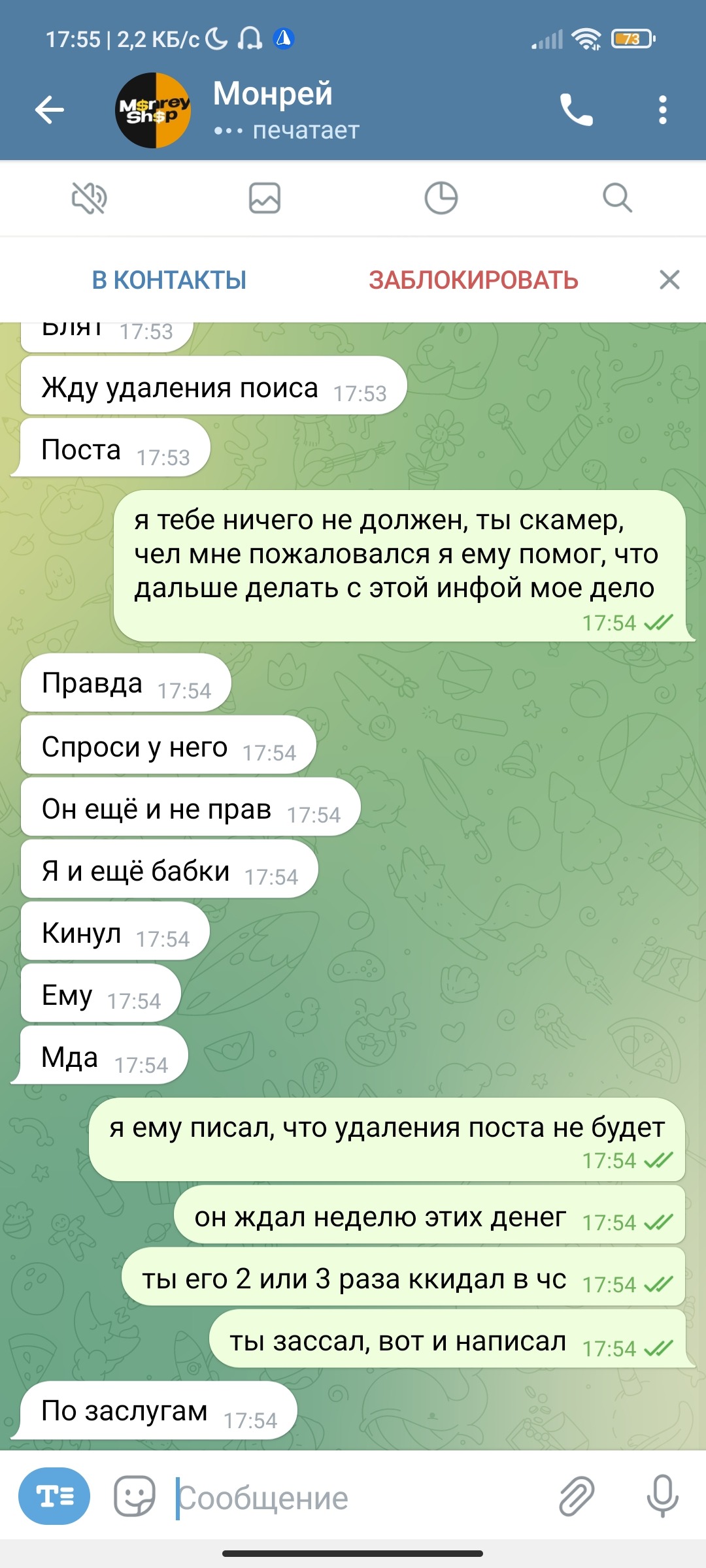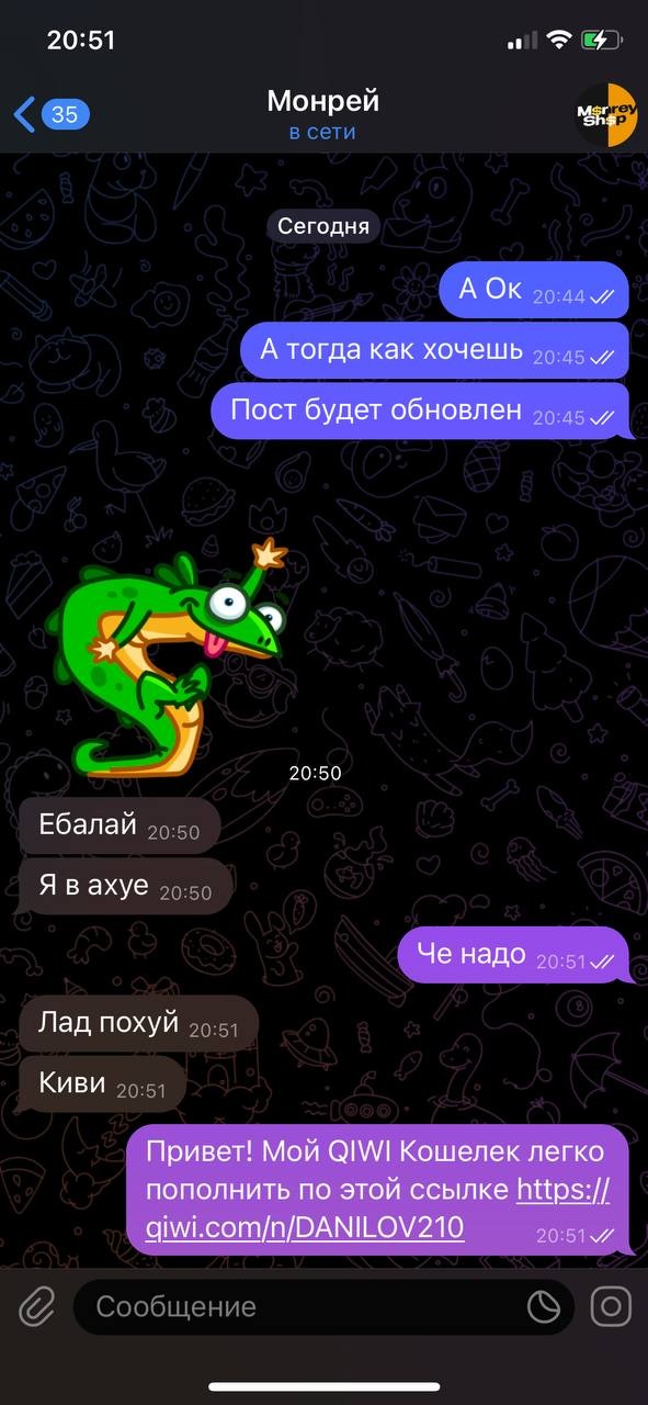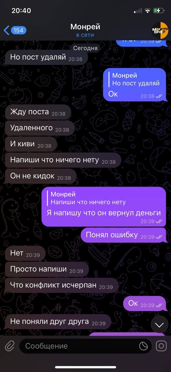 монрей походу не ожидал что мне будут кидать скрины с самого начала переписки и решил удалить, жаль не помогло монрейчик, скамером быть плохо.