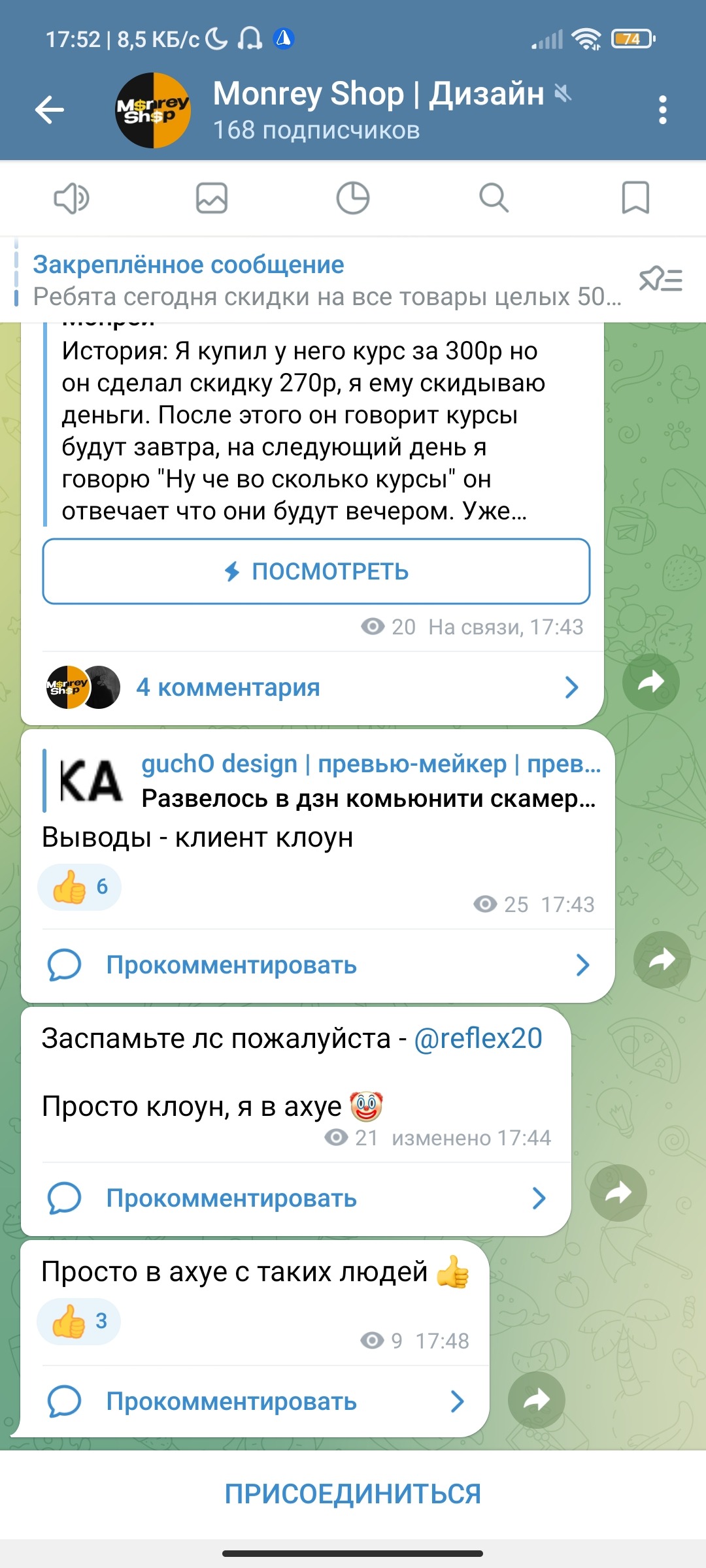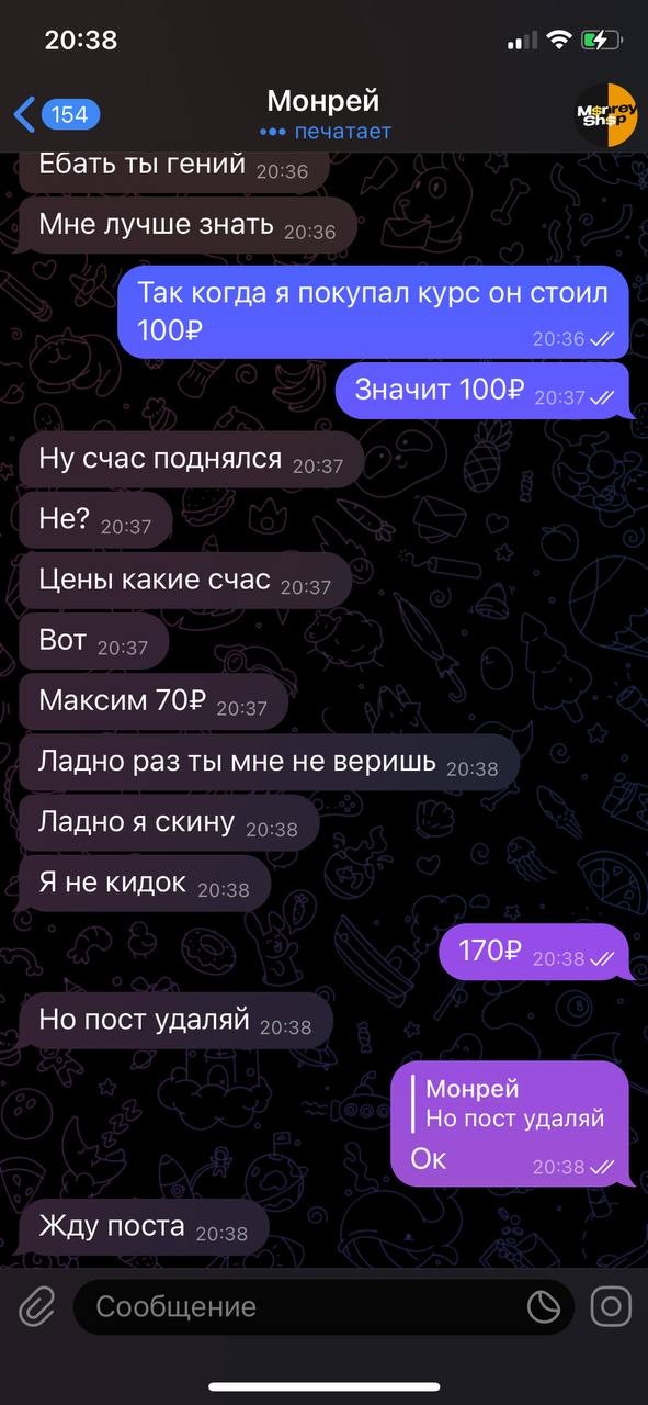 Я купил у него курс за 300р но он сделал скидку 270р, я ему скидываю деньги. После этого он говорит курсы будут завтра, на следующий день я говорю "Ну че во сколько курсы" он отвечает что они будут вечером. Уже вечером он пишет мне что через час они начнутся и тут понеслось.