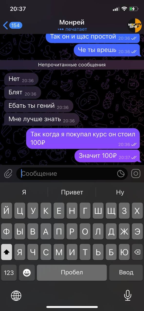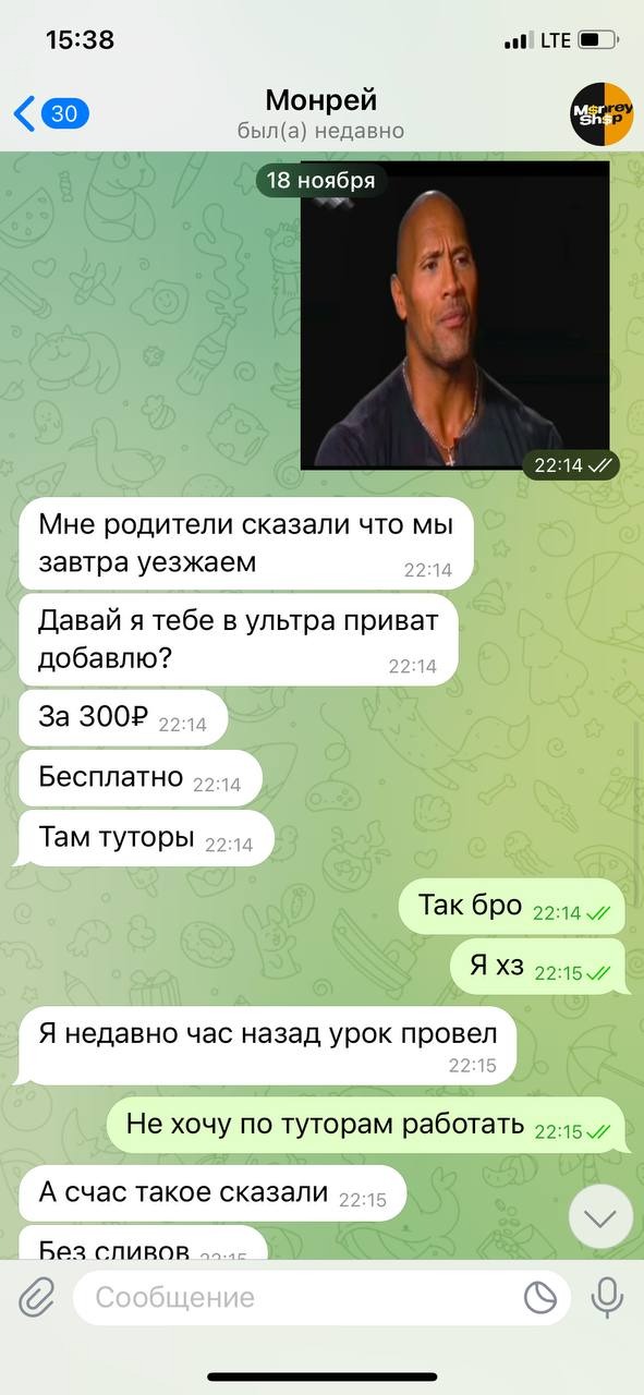 За пол часа он пишет что не может провести т.к его родители сказали что они уезжают, он мне пишет "Давай я тебя добавлю в ультра приват за 300₽ БЕСПЛАТНО" я говорю ок и спрашиваю а курсы будут он говорит "хз" через день я говорю "Блин мне не будет лучше через курсы"