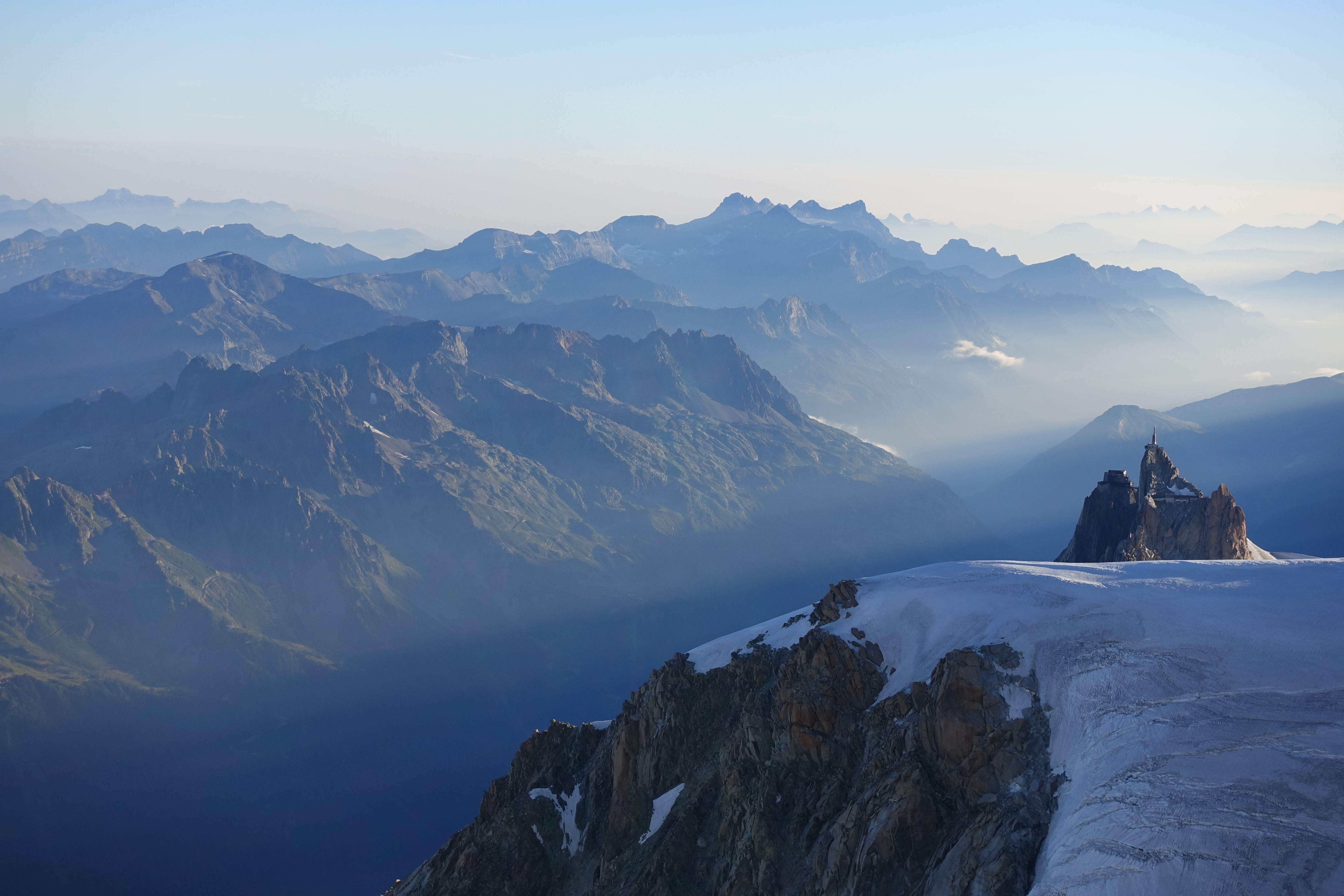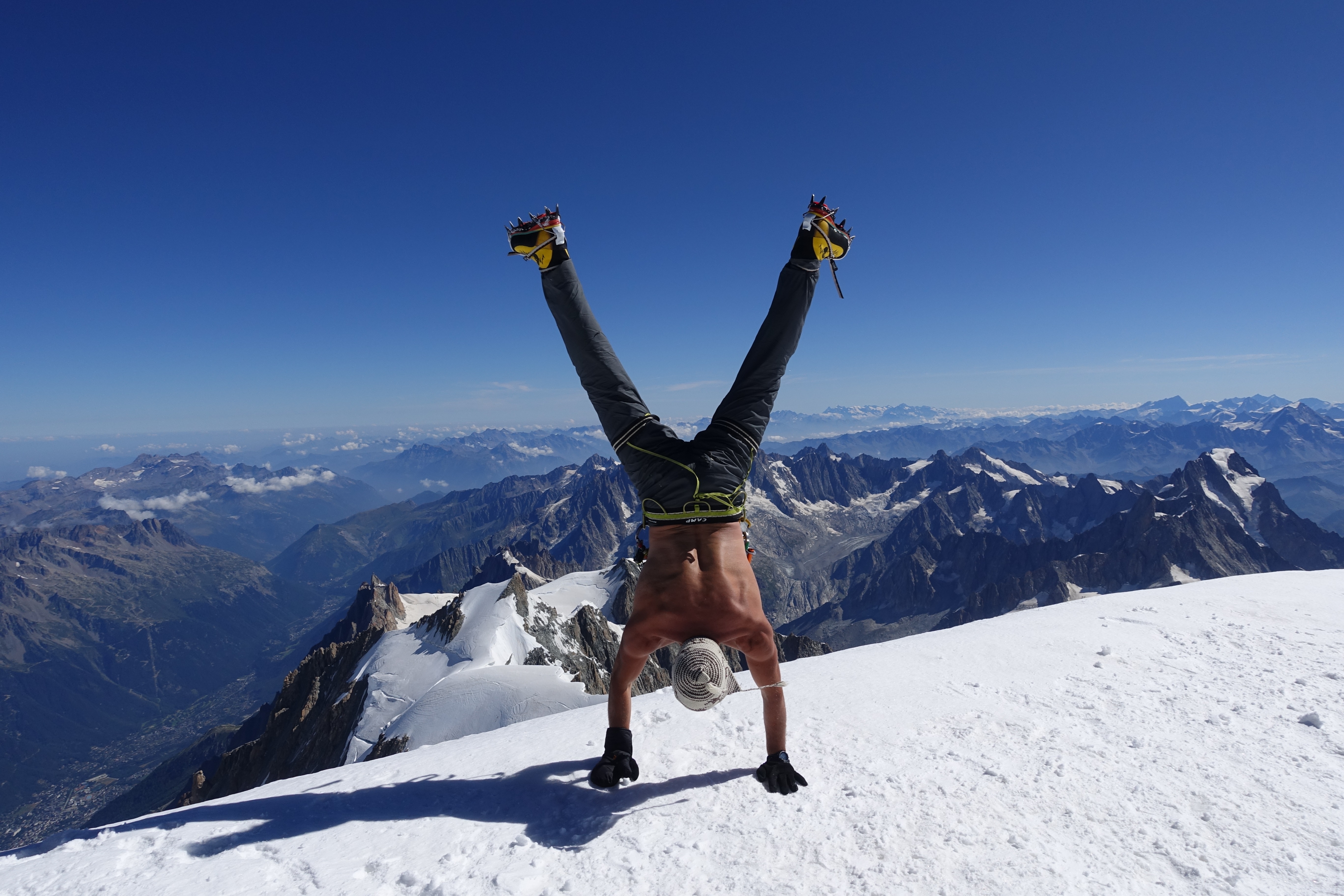 ¡Esta es la famosa cumbre del Mont Blanc a finales de julio! ¡Una vista realmente increíble, comparable a la belleza que lo rodea! Llegamos a la cima en 5 horas y 50 minutos desde Cosmique, lo que no es un récord, pero sí un tiempo bastante normal para un equipo preparado.